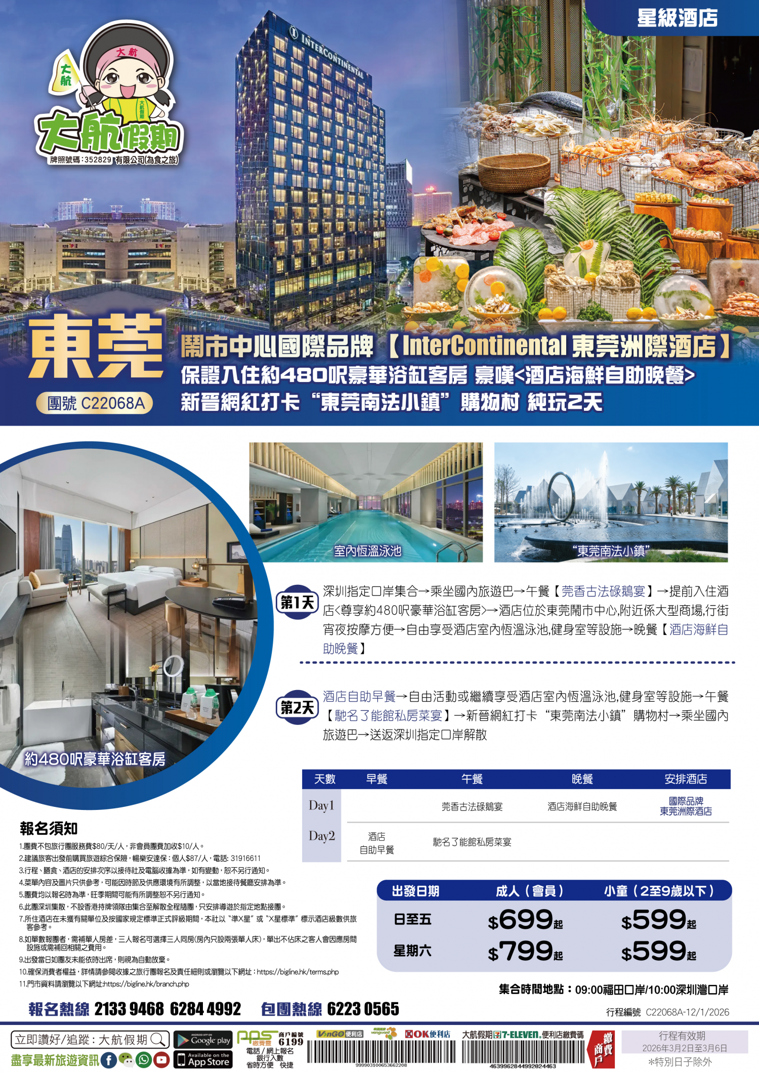 | 第1天 | 莞香古法碌鵝宴 | 酒店海鮮自助晚餐 | 東莞洲際酒店 | |