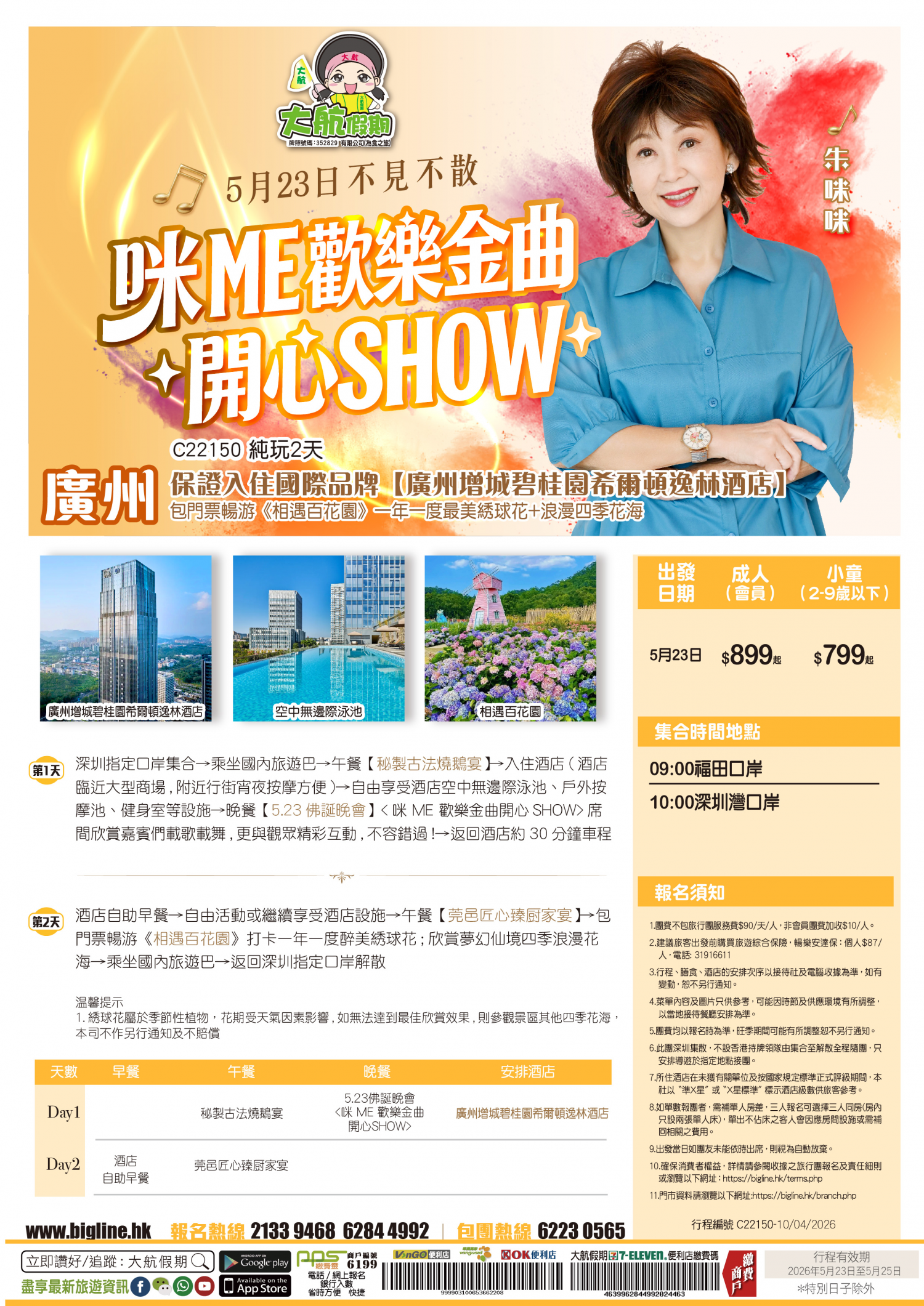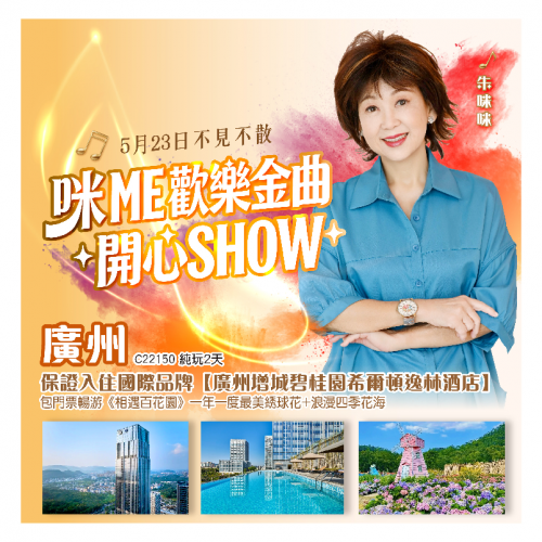 | 第1天 | 秘製古法燒鵝宴 | 【5.23佛誕晚會】<咪 ME 歡樂金曲開心SHOW> | 廣州增城碧桂園希爾頓逸林酒店 | |