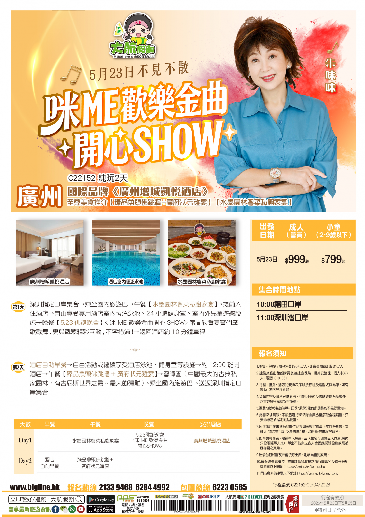 | 第1天 | 水墨園林粵菜私廚家宴 | 【5.23佛誕晚會】<咪 ME 歡樂金曲開心SHOW> | 廣州增城凱悅酒店 | |