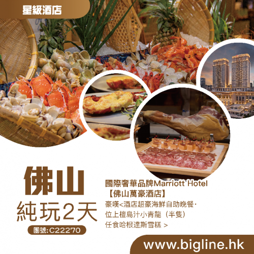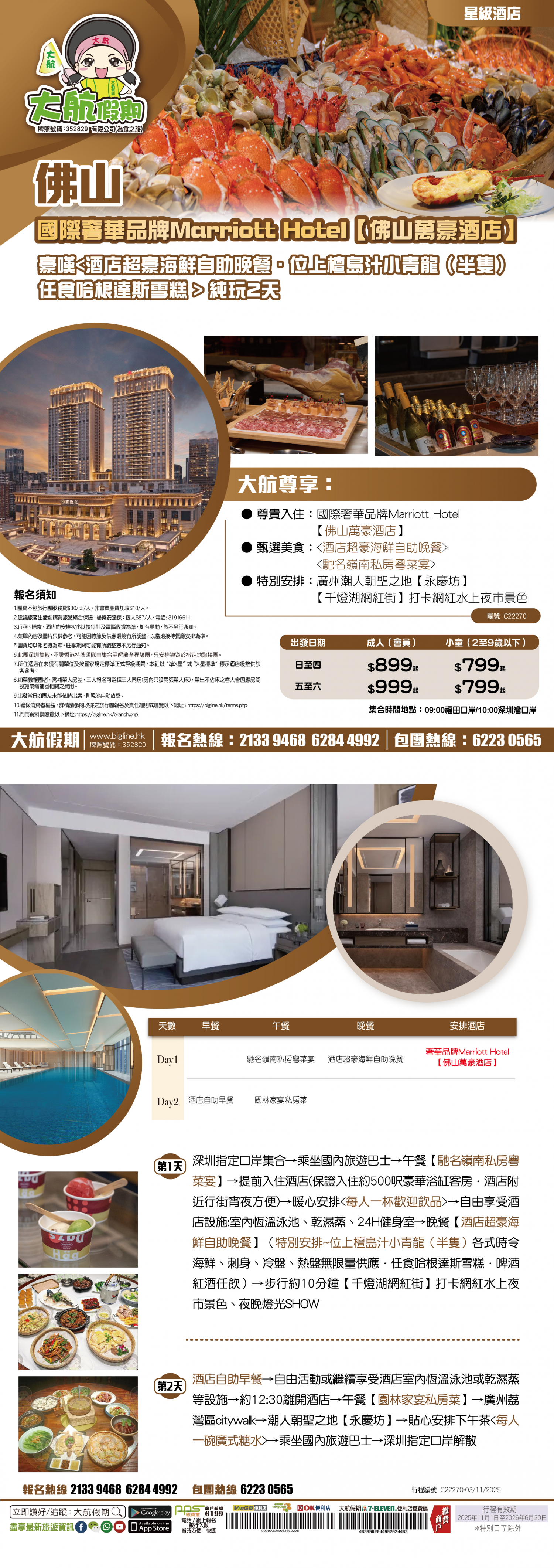 | 第1天 | 馳名嶺南私房粵菜宴 | 酒店超豪海鮮自助晚餐 | 佛山萬豪酒店 | |
