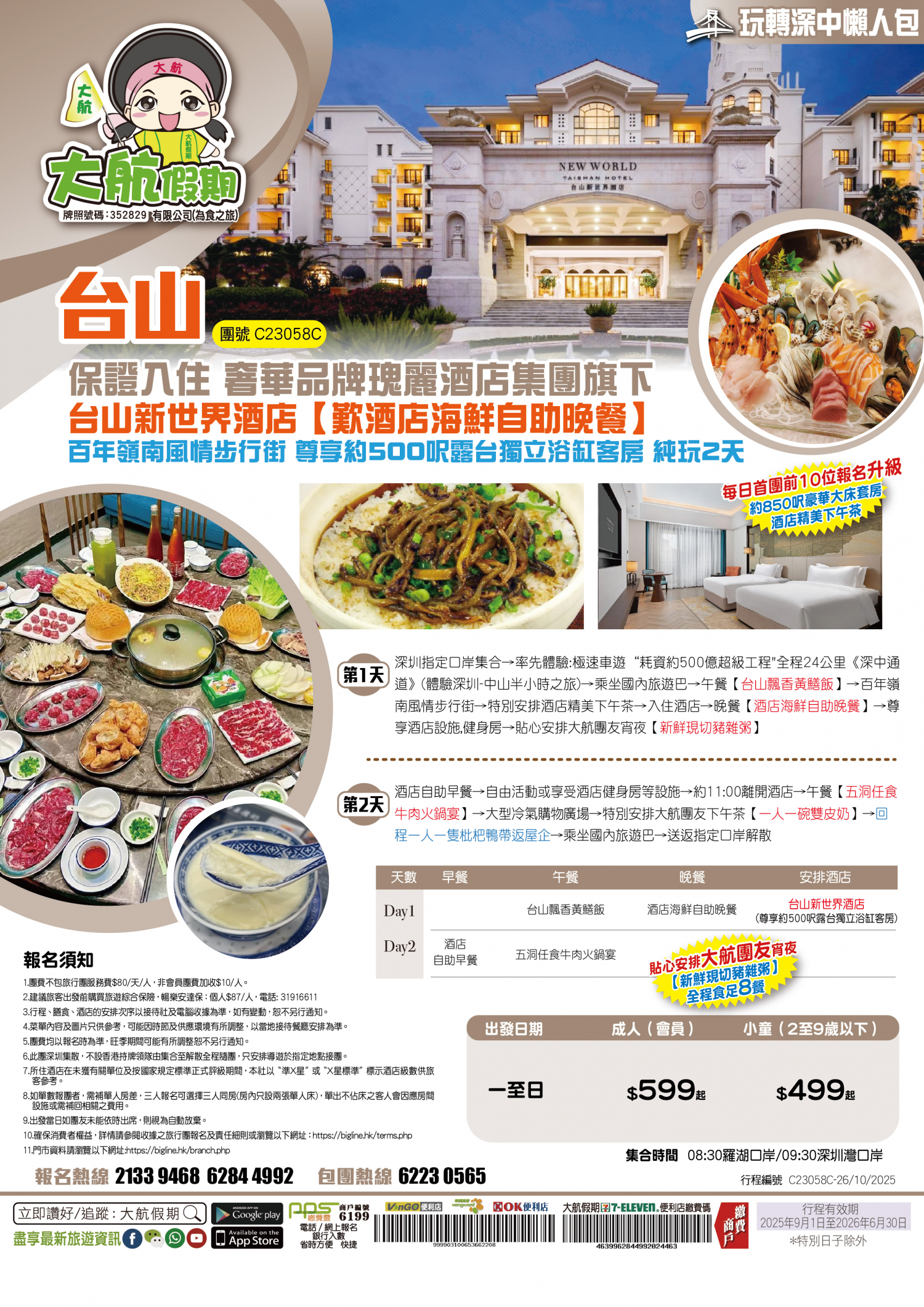 【玩轉深中懶人包-第7集】保證入住奢華品牌瑰麗酒店集團旗下《台山新世界酒店》【歎酒店海鮮自助晚餐+精美下午茶】皇牌推介<五洞任食牛肉火鍋宴> 純玩2天