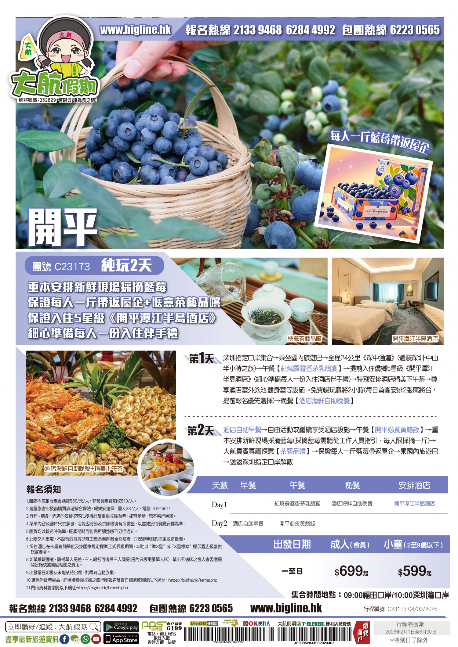 *團員繳付退票費後 (如適用): 1) 已繳款項可保留半年; 或 2) 選擇轉團後, 餘款則保留半年; 或 3) 可繳付『迫不得已理由』之手續費後, 取回已付餘款。 *個別機票+酒店套票產品如因『迫不得已理由』取消外遊行程, 處理旅客退款時亦按以上訂列收取每位退票費及手續費, 並以行程表 (套票單張) 所列為準。 責任細則: 1. 本公司保留合併團隊出發的權利。 2. 行程書或單張內所列費用根據當時機票價格及國際貨幣兌換率而訂立。外幣浮動等情況之下, 本公司保留在出發前調整各項費用的權利及徵收額外費用。 3. 所有列出的交通服務資料只供參考, 如有更改概不負責, 一切須以出票時為準。 4. 除本公司直接提供之服務外, 本公司及其職員或附屬公司或與本公司有經營關係之公司代理人身份在香港或外地安排其他獨立機構所提供之交通工具 (如飛機、輪船、火車、或遊覽巴士等) 、住宿、膳食或娛樂觀光項目等 (“委託機構”), 團員如遇交通延誤、行李遺失、意外傷亡或財物損失等, 該依照當地法律向擁有、管理或操作之委託機構直接交涉或追討賠償, 通常該等機構均各訂位不同條例, 以對客人負責。在此情況下, 本公司概不對該等損失或傷亡負責。 5. 除因由本公司之員工或其他直接管理或操作之機構之疏忽而引致團員之個人傷亡外, 本公司對團員在任何意外中之個人傷亡、經濟、娛樂或精神損失概不負責。 6. 除經本公司同意及安排, 如團員自行更改由其他人士代為參團, 本公司或其委託機構之職員有權取消其隨團之資格, 而無須發還任何團費, 而該人士在隨團期間之保險、責任賠償、行為後果等均由該人仕自行承擔。 7. 如因天氣、罷工、戰爭、怠工或安全情況影響而引致有關交通工具暫停服務, 停航或其他事故, 而必須將行程更改或取消部份行程, 本公司則將團員所繳交之費用扣除因以上事故而引致之損失後, 退回差額給團員。 8. 有關住宿、膳食、遊覽節目等問題, 均依據行程表安排, 行程先後次序有可能需要更改, 一切以當地安排為準。若遇特殊情況, 如簽證受阻, 當地酒店突告客滿或航機改變飛行時間或地點, 以及非本公司或其委託機構所能控制之因素, 令旅行團節目有增減, 或臨時更改交通工具、班機時間、機種及更換酒店等等, 本公司或其委託機構得依當時情況全權盡力處理, 團員不得藉故反對或退出, 因故取消之節目, 將不獲退還款項, 任何因延期而引致之額外支出, 本公司或其委託機構概不負責。 9. 所有酒店及住宿根據行程安排, 本公司視乎當時情形作出更改, 但不限於遇展覽會或特殊情況下, 將住宿鄰近城市之同等級酒店及住宿代替。本公司如因『迫不得已理由(外遊)』(即指戰爭、政治動盪、恐怖襲擊、天災、疫症、惡劣天氣、交通工具發生技術問題、載運機構臨時更改班次或取消服務、罷工、工業行動、旅遊目的地政府或世界衛生組織發出旅遊警示(警告)、香港特別行政區政府發出紅色或黑色外遊警示、不可抗力事件,以及業界不能控制的其他不利離開香港或在香港境外旅遊的情況)於外遊旅行團出發後更改任何項目而引致成本增加,可向顧客徵收額外費用。 10. 【已成團】代表該團號之指定出發日期預訂機位或已有足夠人數報名參加。但出發與否還受其他因素影響, 本公司保留最終決定權。 11. 任何團員在參與各項活動時, 如經常不遵守服飾人員之指引或安排, 在行動或言語上侮辱或滋擾其他團員或工作人員, 本公司或其委託機構職員有權視具體情況而取消其隨團資格而母須發任何團費, 而受該旅客監護之18歲以下同行團員亦須一併離開, 有關旅客離團後一切活動, 概與本公司或其委託機構無關。 12. 團員如欲於旅程完畢後延期返港, 須於出發前十四天提出, 以便本公司代為預定返港機位, 延期返港之機位, 未能即時作實, 團員不得藉此理由要求退出, 旅程完畢後延期逗留之費用, 概由團員自負。 13. 延期返港之團友, 必須在離境前七十二小時向航空公司確實回程機位, 任何機位如有變更, 概與本公司無關。 14. 團員如在旅途中自行離團或放棄行程, 離團後之責任自負, 一切後果與本公司或其委託機構無關。 15. 參團者須切實遵守各國及各地法例, 包括但不限於防疫防控條例, 並嚴禁攜帶違例物品出入境, 並照實申報攜帶之物品及現金。 16. 任何種類的簽證審批權及出入境批准權一律由該國或地區之領事館及/或出入境部門全權決定, 出入境如有問題, 責任旅客自負, 本公司或其委託機構母須負任何責任。如簽證已代辦, 簽證費恕不退還。 17. 即使團員持有效之入境簽證及旅遊證件, 而於入境時被當值之移民局海關人員拒絕入境, 本公司或其委託機構亦無須負任何責任。所需額外安排之食宿、交通費用、全部由其本人負責, 其餘下的行程亦將不會獲得任何補償, 亦不得要求退款或改團。 18. 中國內地相關法規規定, 即日起旅客入住中國內地境內酒店時, 公安機關會透過酒店前台向旅客一併採集人像信息資訊。 19. 如出現一些非本公司能力範圍可控制之問題 (如花卉、紅葉提早凋謝或景觀、自然現象、景點活動或戶外項目) 會受天氣等因素影響, 如未能安排則取消不作任何退款安排。 20. 旅客如在旅程中確診 COVID-19或其他傳染病,無論受到當地政府隔離或其他檢疫要求影響與否,為確保其他旅客之安全,確診旅
