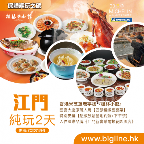 | 第1天 | 位上仙參鳳凰湯+ 私房香茅焗大虾 | 楓林小館 | 江門新會希爾頓花園酒店(大航) | |
