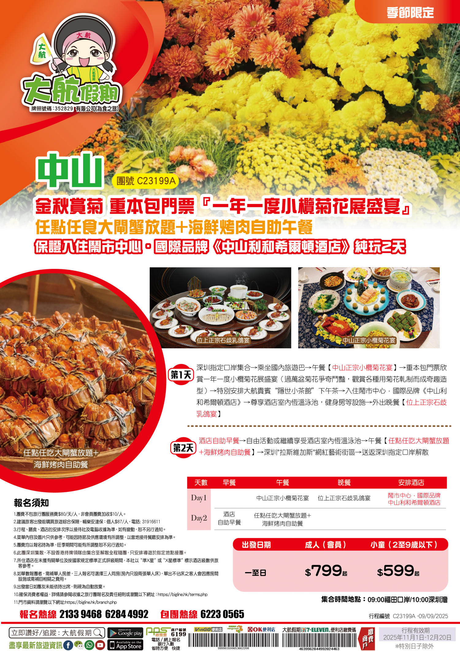 【季節限定】一年一度中山菊花展盛會+圭峰山森林公園賞『楓』色 品味【菊花八寶果子鴨】+【金秋大閘蟹撈雞宴】國際品牌《中山利和希爾頓酒店》嘆酒店海鮮自助晚餐 純玩3天