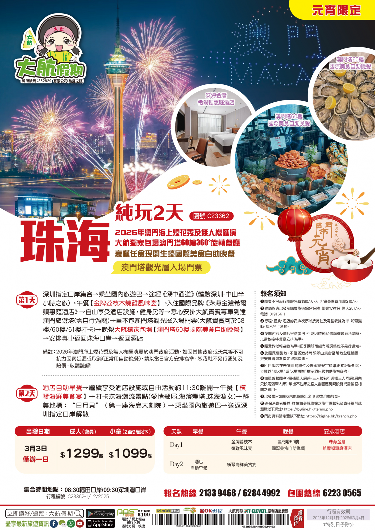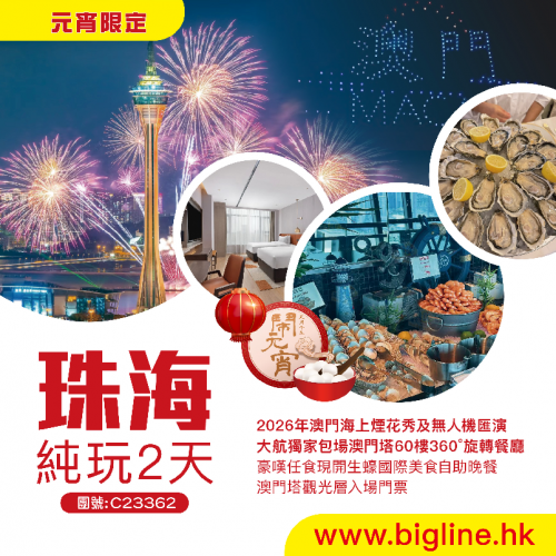 【元宵限定】下午出發 2026年澳門海上煙花秀及無人機匯演 大航獨家包場澳門塔60樓360°旋轉餐廳 豪嘆任食現開生蠔國際美食自助晚餐 保證入住洲際酒店集團旗下《珠海拱北智選假日酒店》 純玩2