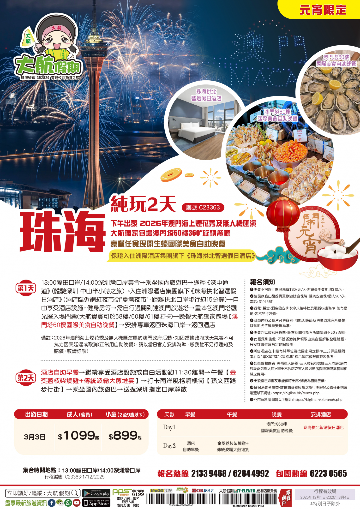 | 第1天 | 重本包澳門塔60樓360°旋轉餐廳自助晚餐 | 珠海拱北智選假日酒店 | ||