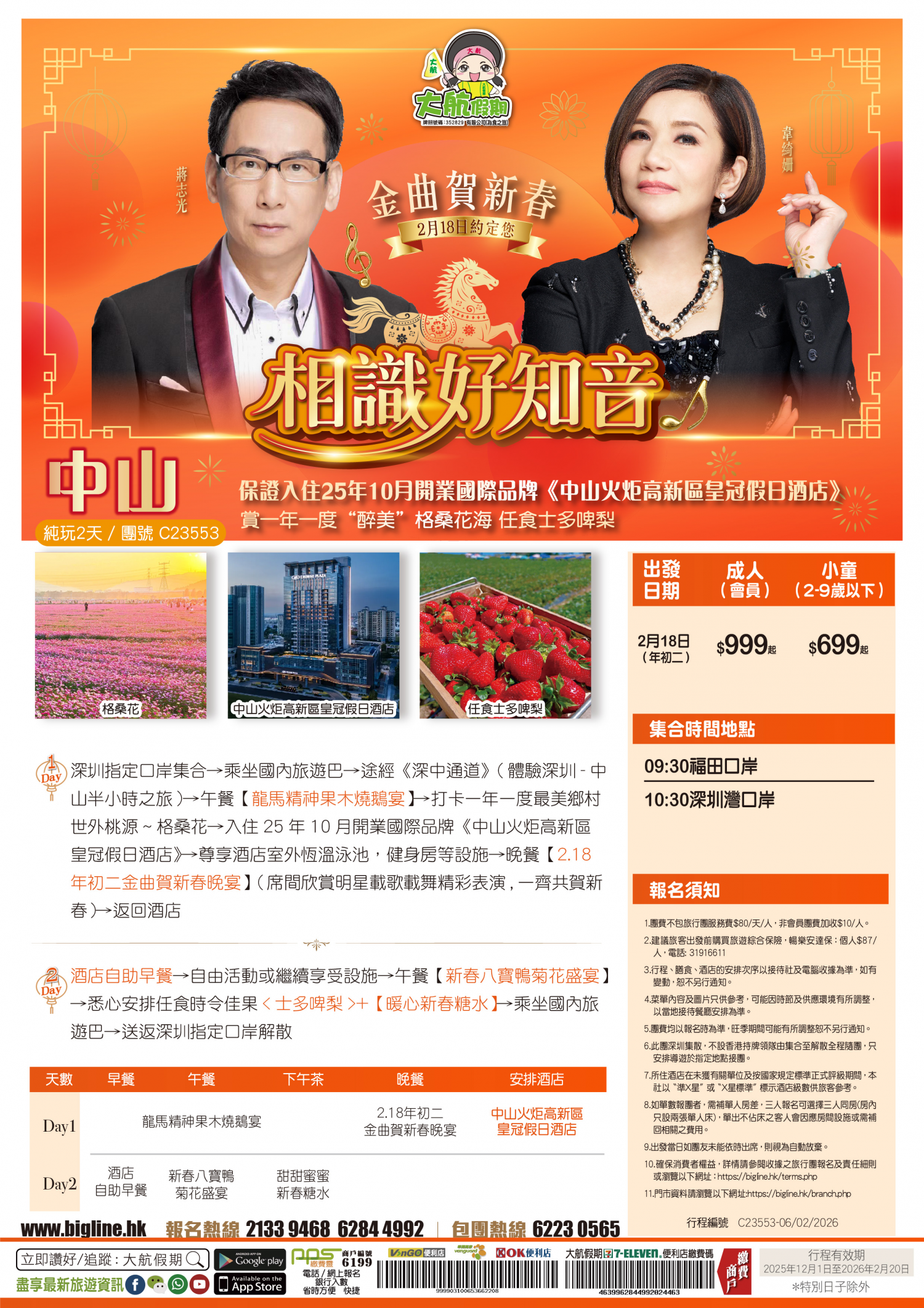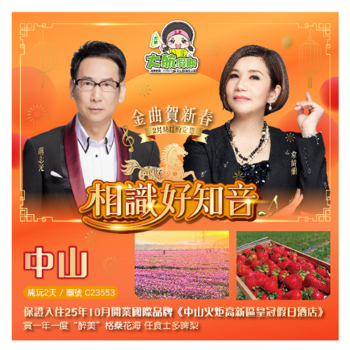 | 第1天 | 龍馬精神果木燒鵝宴 | 2.18年初二金曲賀新春晚宴 | 中山火炬高新區皇冠假日酒店 | |