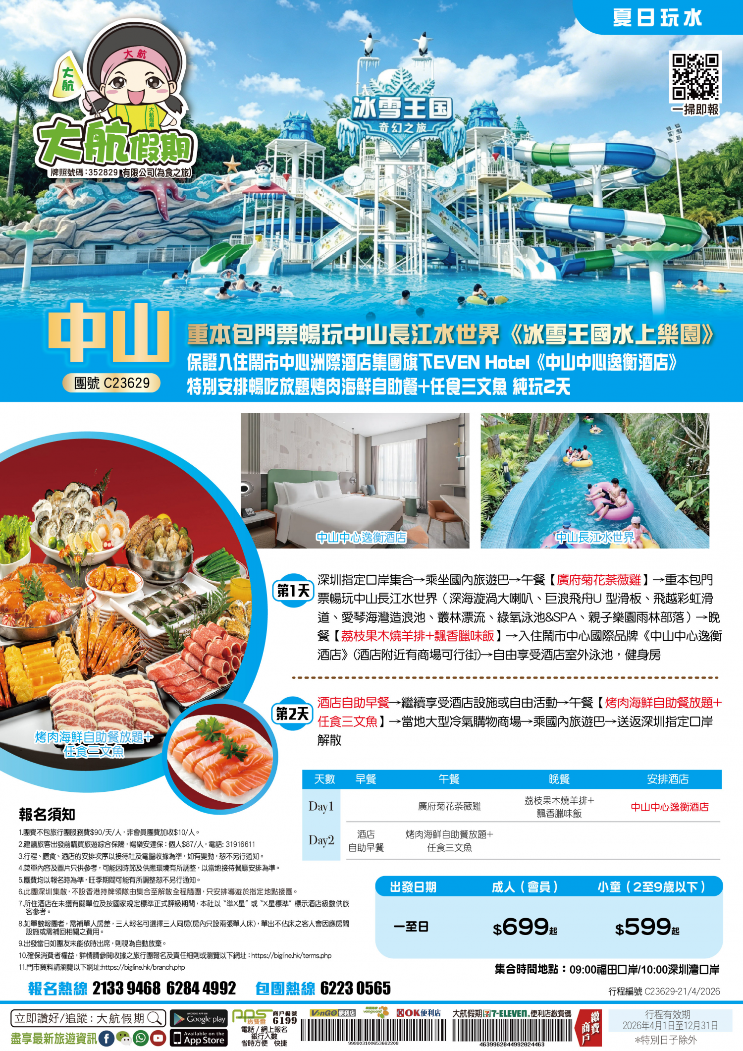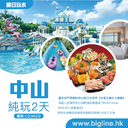 【夏日玩水】重本包門票暢玩中山長江水世界《冰雪王國水上樂園》保證入住鬧市中心~洲際酒店集團旗下EVEN Hotel《中山中心逸衡酒店》特別安排暢吃放題烤肉海鮮自助餐+任食三文魚 純玩2天