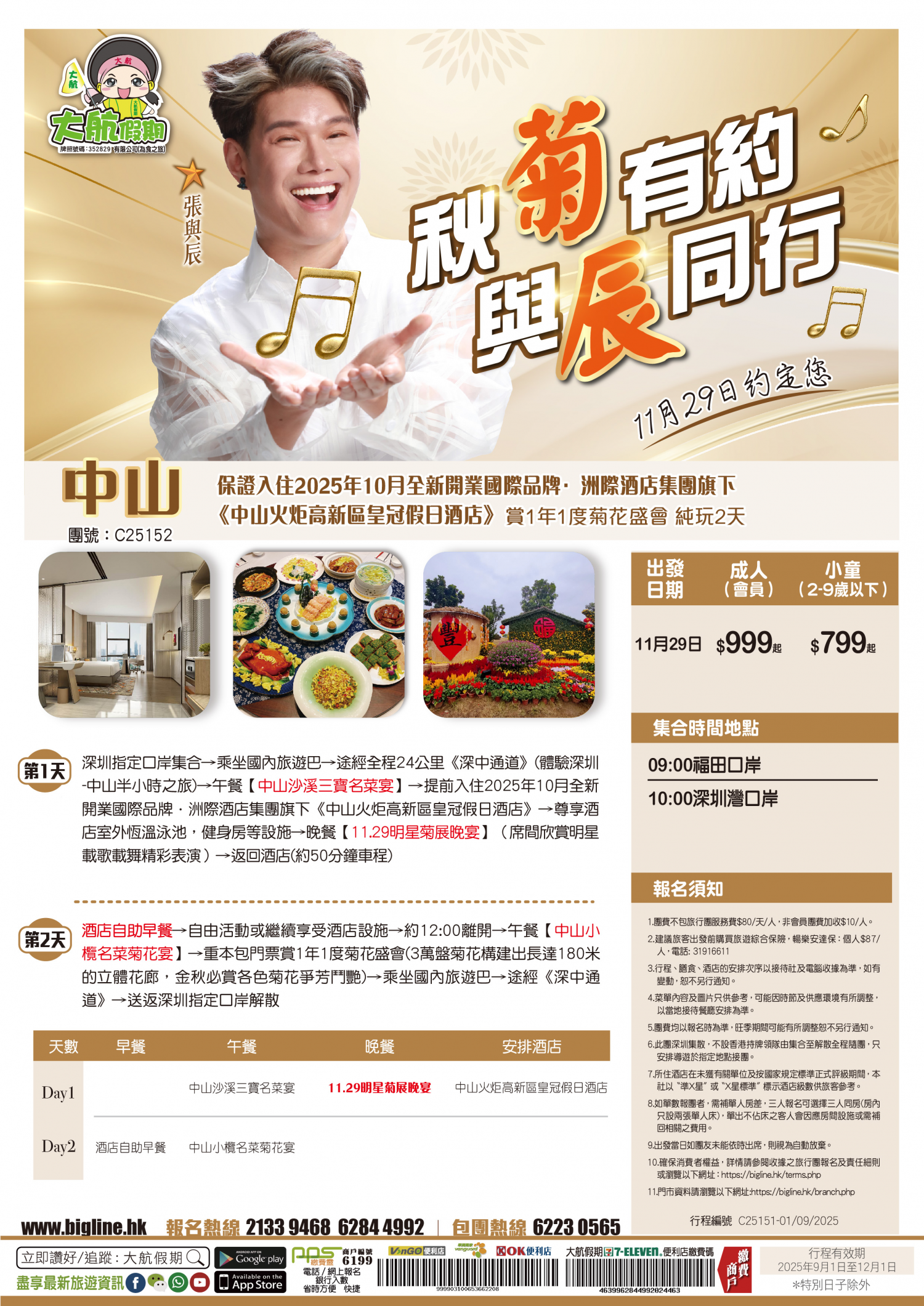 | 第1天 | 中山沙溪三寶名菜宴 | 11.29菊展明星晚宴 | 中山火炬高新區皇冠假日酒店 | |