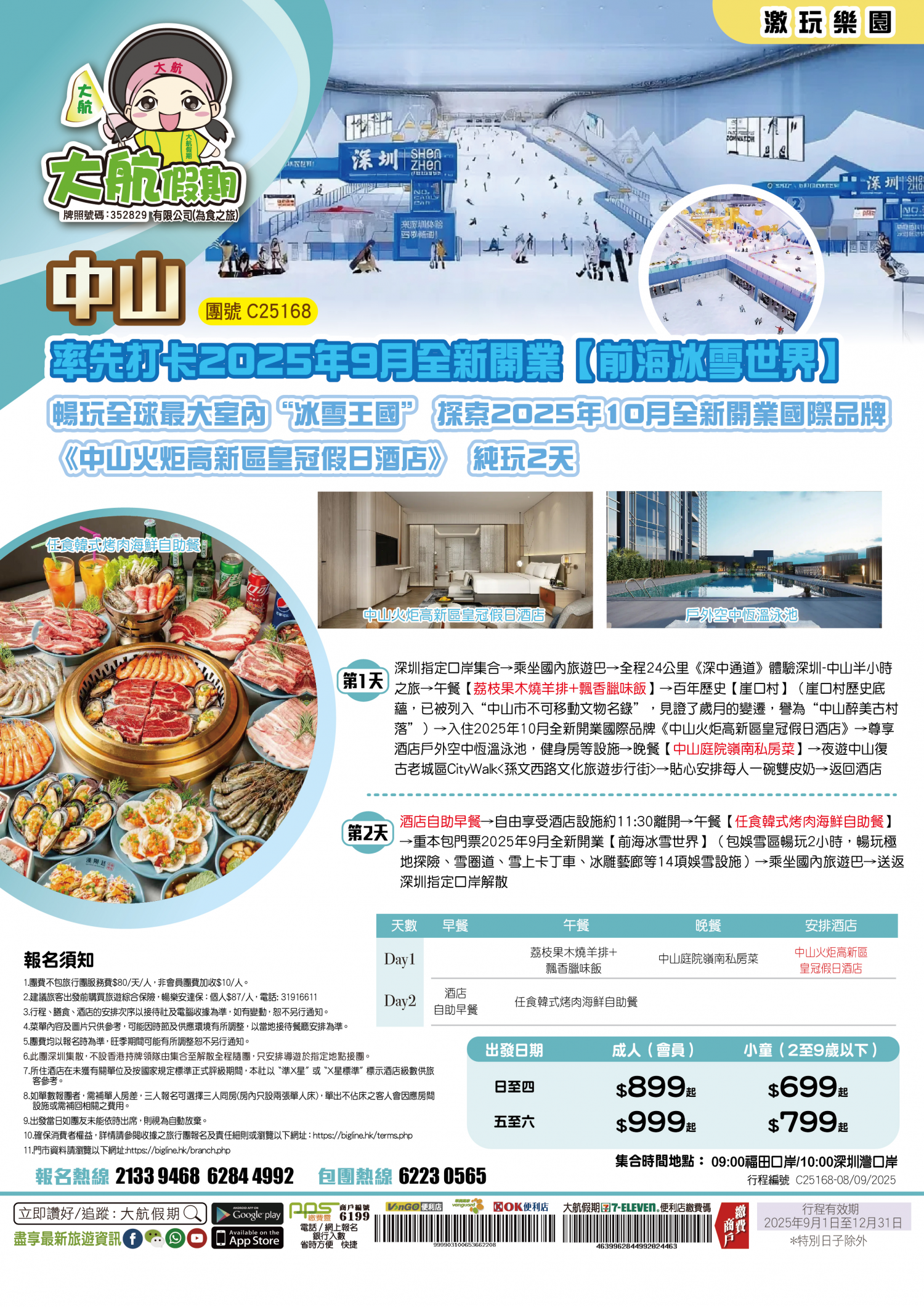 特別安排率先打卡2025年9月全新開業【前海冰雪世界】暢玩全球最大室內“冰雪王國”+探索2025年10月全新開業國際品牌《中山火炬高新區皇冠假日酒店》純玩2天