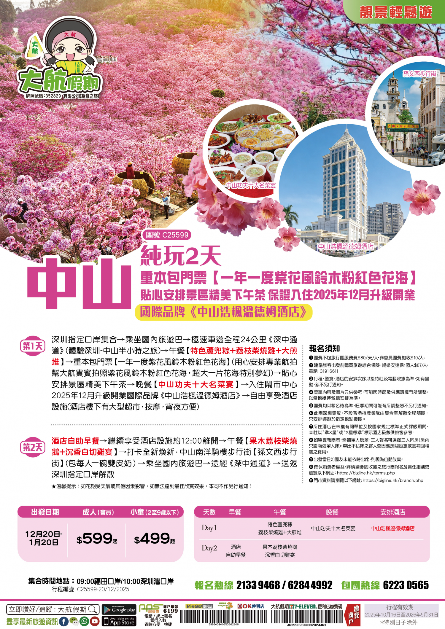 *團員繳付退票費後 (如適用): 1) 已繳款項可保留半年; 或 2) 選擇轉團後, 餘款則保留半年; 或 3) 可繳付『迫不得已理由』之手續費後, 取回已付餘款。 *個別機票+酒店套票產品如因『迫不得已理由』取消外遊行程, 處理旅客退款時亦按以上訂列收取每位退票費及手續費, 並以行程表 (套票單張) 所列為準。 責任細則: 1. 本公司保留合併團隊出發的權利。 2. 行程書或單張內所列費用根據當時機票價格及國際貨幣兌換率而訂立。外幣浮動等情況之下, 本公司保留在出發前調整各項費用的權利及徵收額外費用。 3. 所有列出的交通服務資料只供參考, 如有更改概不負責, 一切須以出票時為準。 4. 除本公司直接提供之服務外, 本公司及其職員或附屬公司或與本公司有經營關係之公司代理人身份在香港或外地安排其他獨立機構所提供之交通工具 (如飛機、輪船、火車、或遊覽巴士等) 、住宿、膳食或娛樂觀光項目等 (“委託機構”), 團員如遇交通延誤、行李遺失、意外傷亡或財物損失等, 該依照當地法律向擁有、管理或操作之委託機構直接交涉或追討賠償, 通常該等機構均各訂位不同條例, 以對客人負責。在此情況下, 本公司概不對該等損失或傷亡負責。 5. 除因由本公司之員工或其他直接管理或操作之機構之疏忽而引致團員之個人傷亡外, 本公司對團員在任何意外中之個人傷亡、經濟、娛樂或精神損失概不負責。 6. 除經本公司同意及安排, 如團員自行更改由其他人士代為參團, 本公司或其委託機構之職員有權取消其隨團之資格, 而無須發還任何團費, 而該人士在隨團期間之保險、責任賠償、行為後果等均由該人仕自行承擔。 7. 如因天氣、罷工、戰爭、怠工或安全情況影響而引致有關交通工具暫停服務, 停航或其他事故, 而必須將行程更改或取消部份行程, 本公司則將團員所繳交之費用扣除因以上事故而引致之損失後, 退回差額給團員。 8. 有關住宿、膳食、遊覽節目等問題, 均依據行程表安排, 行程先後次序有可能需要更改, 一切以當地安排為準。若遇特殊情況, 如簽證受阻, 當地酒店突告客滿或航機改變飛行時間或地點, 以及非本公司或其委託機構所能控制之因素, 令旅行團節目有增減, 或臨時更改交通工具、班機時間、機種及更換酒店等等, 本公司或其委託機構得依當時情況全權盡力處理, 團員不得藉故反對或退出, 因故取消之節目, 將不獲退還款項, 任何因延期而引致之額外支出, 本公司或其委託機構概不負責。 9. 所有酒店及住宿根據行程安排, 本公司視乎當時情形作出更改, 但不限於遇展覽會或特殊情況下, 將住宿鄰近城市之同等級酒店及住宿代替。本公司如因『迫不得已理由(外遊)』(即指戰爭、政治動盪、恐怖襲擊、天災、疫症、惡劣天氣、交通工具發生技術問題、載運機構臨時更改班次或取消服務、罷工、工業行動、旅遊目的地政府或世界衛生組織發出旅遊警示(警告)、香港特別行政區政府發出紅色或黑色外遊警示、不可抗力事件,以及業界不能控制的其他不利離開香港或在香港境外旅遊的情況)於外遊旅行團出發後更改任何項目而引致成本增加,可向顧客徵收額外費用。 10. 【已成團】代表該團號之指定出發日期預訂機位或已有足夠人數報名參加。但出發與否還受其他因素影響, 本公司保留最終決定權。 11. 任何團員在參與各項活動時, 如經常不遵守服飾人員之指引或安排, 在行動或言語上侮辱或滋擾其他團員或工作人員, 本公司或其委託機構職員有權視具體情況而取消其隨團資格而母須發任何團費, 而受該旅客監護之18歲以下同行團員亦須一併離開, 有關旅客離團後一切活動, 概與本公司或其委託機構無關。 12. 團員如欲於旅程完畢後延期返港, 須於出發前十四天提出, 以便本公司代為預定返港機位, 延期返港之機位, 未能即時作實, 團員不得藉此理由要求退出, 旅程完畢後延期逗留之費用, 概由團員自負。 13. 延期返港之團友, 必須在離境前七十二小時向航空公司確實回程機位, 任何機位如有變更, 概與本公司無關。 14. 團員如在旅途中自行離團或放棄行程, 離團後之責任自負, 一切後果與本公司或其委託機構無關。 15. 參團者須切實遵守各國及各地法例, 包括但不限於防疫防控條例, 並嚴禁攜帶違例物品出入境, 並照實申報攜帶之物品及現金。 16. 任何種類的簽證審批權及出入境批准權一律由該國或地區之領事館及/或出入境部門全權決定, 出入境如有問題, 責任旅客自負, 本公司或其委託機構母須負任何責任。如簽證已代辦, 簽證費恕不退還。 17. 即使團員持有效之入境簽證及旅遊證件, 而於入境時被當值之移民局海關人員拒絕入境, 本公司或其委託機構亦無須負任何責任。所需額外安排之食宿、交通費用、全部由其本人負責, 其餘下的行程亦將不會獲得任何補償, 亦不得要求退款或改團。 18. 中國內地相關法規規定, 即日起旅客入住中國內地境內酒店時, 公安機關會透過酒店前台向旅客一併採集人像信息資訊。 19. 如出現一些非本公司能力範圍可控制之問題 (如花卉、紅葉提早凋謝或景觀、自然現象、景點活動或戶外項目) 會受天氣等因素影響, 如未能安排則取消不作任何退款安排。 20. 旅客如在旅程中確診 COVID-19或其他傳染病,無論受到當地政府隔離或其他檢疫要求影響與否,為確保其他旅客之安全,確診旅