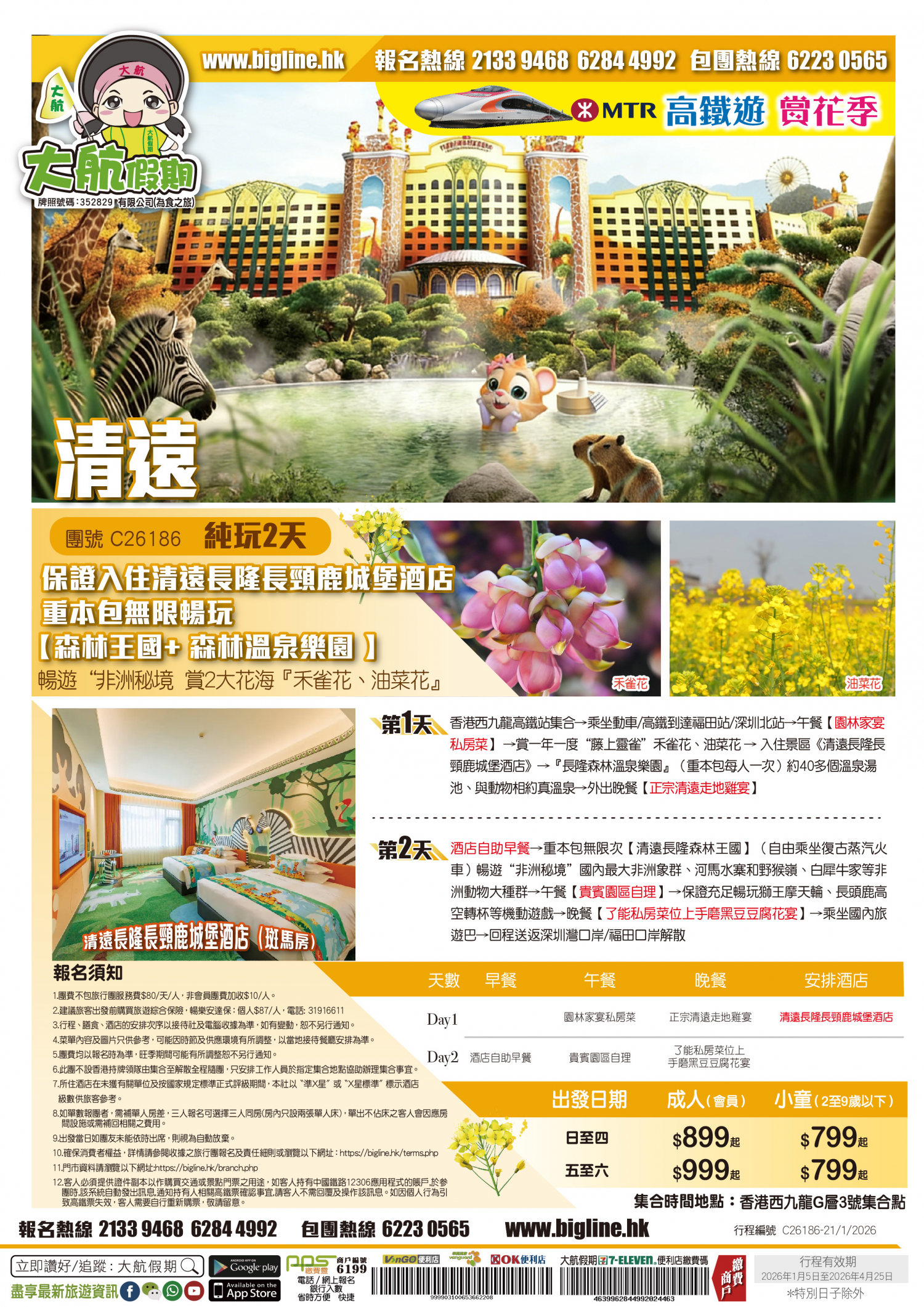 *團員繳付退票費後 (如適用): 1) 已繳款項可保留半年; 或 2) 選擇轉團後, 餘款則保留半年; 或 3) 可繳付『迫不得已理由』之手續費後, 取回已付餘款。 *個別機票+酒店套票產品如因『迫不得已理由』取消外遊行程, 處理旅客退款時亦按以上訂列收取每位退票費及手續費, 並以行程表 (套票單張) 所列為準。 責任細則: 1. 本公司保留合併團隊出發的權利。 2. 行程書或單張內所列費用根據當時機票價格及國際貨幣兌換率而訂立。外幣浮動等情況之下, 本公司保留在出發前調整各項費用的權利及徵收額外費用。 3. 所有列出的交通服務資料只供參考, 如有更改概不負責, 一切須以出票時為準。 4. 除本公司直接提供之服務外, 本公司及其職員或附屬公司或與本公司有經營關係之公司代理人身份在香港或外地安排其他獨立機構所提供之交通工具 (如飛機、輪船、火車、或遊覽巴士等) 、住宿、膳食或娛樂觀光項目等 (“委託機構”), 團員如遇交通延誤、行李遺失、意外傷亡或財物損失等, 該依照當地法律向擁有、管理或操作之委託機構直接交涉或追討賠償, 通常該等機構均各訂位不同條例, 以對客人負責。在此情況下, 本公司概不對該等損失或傷亡負責。 5. 除因由本公司之員工或其他直接管理或操作之機構之疏忽而引致團員之個人傷亡外, 本公司對團員在任何意外中之個人傷亡、經濟、娛樂或精神損失概不負責。 6. 除經本公司同意及安排, 如團員自行更改由其他人士代為參團, 本公司或其委託機構之職員有權取消其隨團之資格, 而無須發還任何團費, 而該人士在隨團期間之保險、責任賠償、行為後果等均由該人仕自行承擔。 7. 如因天氣、罷工、戰爭、怠工或安全情況影響而引致有關交通工具暫停服務, 停航或其他事故, 而必須將行程更改或取消部份行程, 本公司則將團員所繳交之費用扣除因以上事故而引致之損失後, 退回差額給團員。 8. 有關住宿、膳食、遊覽節目等問題, 均依據行程表安排, 行程先後次序有可能需要更改, 一切以當地安排為準。若遇特殊情況, 如簽證受阻, 當地酒店突告客滿或航機改變飛行時間或地點, 以及非本公司或其委託機構所能控制之因素, 令旅行團節目有增減, 或臨時更改交通工具、班機時間、機種及更換酒店等等, 本公司或其委託機構得依當時情況全權盡力處理, 團員不得藉故反對或退出, 因故取消之節目, 將不獲退還款項, 任何因延期而引致之額外支出, 本公司或其委託機構概不負責。 9. 所有酒店及住宿根據行程安排, 本公司視乎當時情形作出更改, 但不限於遇展覽會或特殊情況下, 將住宿鄰近城市之同等級酒店及住宿代替。本公司如因『迫不得已理由(外遊)』(即指戰爭、政治動盪、恐怖襲擊、天災、疫症、惡劣天氣、交通工具發生技術問題、載運機構臨時更改班次或取消服務、罷工、工業行動、旅遊目的地政府或世界衛生組織發出旅遊警示(警告)、香港特別行政區政府發出紅色或黑色外遊警示、不可抗力事件,以及業界不能控制的其他不利離開香港或在香港境外旅遊的情況)於外遊旅行團出發後更改任何項目而引致成本增加,可向顧客徵收額外費用。 10. 【已成團】代表該團號之指定出發日期預訂機位或已有足夠人數報名參加。但出發與否還受其他因素影響, 本公司保留最終決定權。 11. 任何團員在參與各項活動時, 如經常不遵守服飾人員之指引或安排, 在行動或言語上侮辱或滋擾其他團員或工作人員, 本公司或其委託機構職員有權視具體情況而取消其隨團資格而母須發任何團費, 而受該旅客監護之18歲以下同行團員亦須一併離開, 有關旅客離團後一切活動, 概與本公司或其委託機構無關。 12. 團員如欲於旅程完畢後延期返港, 須於出發前十四天提出, 以便本公司代為預定返港機位, 延期返港之機位, 未能即時作實, 團員不得藉此理由要求退出, 旅程完畢後延期逗留之費用, 概由團員自負。 13. 延期返港之團友, 必須在離境前七十二小時向航空公司確實回程機位, 任何機位如有變更, 概與本公司無關。 14. 團員如在旅途中自行離團或放棄行程, 離團後之責任自負, 一切後果與本公司或其委託機構無關。 15. 參團者須切實遵守各國及各地法例, 包括但不限於防疫防控條例, 並嚴禁攜帶違例物品出入境, 並照實申報攜帶之物品及現金。 16. 任何種類的簽證審批權及出入境批准權一律由該國或地區之領事館及/或出入境部門全權決定, 出入境如有問題, 責任旅客自負, 本公司或其委託機構母須負任何責任。如簽證已代辦, 簽證費恕不退還。 17. 即使團員持有效之入境簽證及旅遊證件, 而於入境時被當值之移民局海關人員拒絕入境, 本公司或其委託機構亦無須負任何責任。所需額外安排之食宿、交通費用、全部由其本人負責, 其餘下的行程亦將不會獲得任何補償, 亦不得要求退款或改團。 18. 中國內地相關法規規定, 即日起旅客入住中國內地境內酒店時, 公安機關會透過酒店前台向旅客一併採集人像信息資訊。 19. 如出現一些非本公司能力範圍可控制之問題 (如花卉、紅葉提早凋謝或景觀、自然現象、景點活動或戶外項目) 會受天氣等因素影響, 如未能安排則取消不作任何退款安排。 20. 旅客如在旅程中確診 COVID-19或其他傳染病,無論受到當地政府隔離或其他檢疫要求影響與否,為確保其他旅客之安全,確診旅