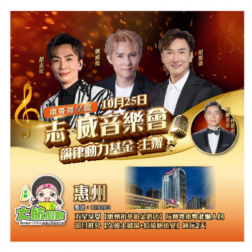 第1天 | 久違土豬湯+紅燜鮑魚宴 | 10.25志威音樂會晚宴 | 惠州惠陽裕華鉑金酒店 | |