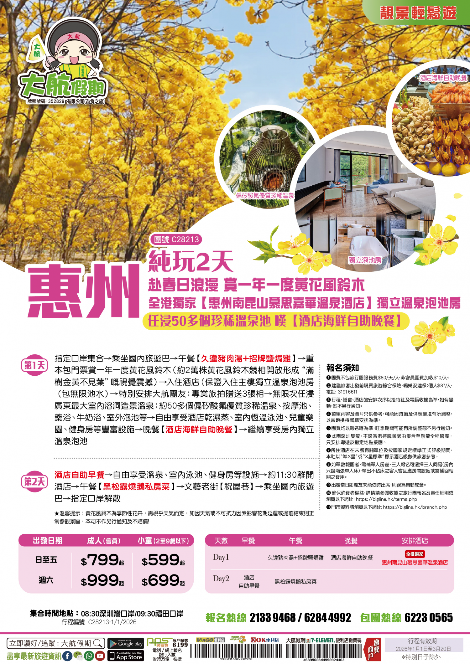 【季節限定】赴春日浪漫 賞一年一度黃花風鈴木 全港獨家【惠州南昆山慕思嘉華溫泉酒店】入住主樓獨立泡池房 嘆【酒店海鮮自助晚餐】任浸50多個珍稀溫泉池 純玩2天