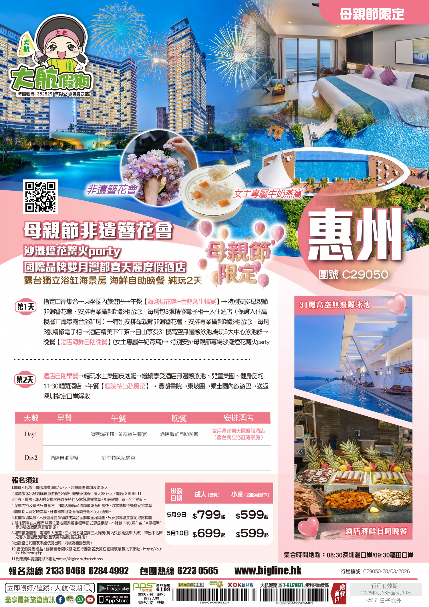 | 第1天 | 海鹽焗花螺+金蒜蒸生蠔宴 | 【酒店海鮮自助晚餐】(女士專屬牛奶燕窩) | 雙月灣檀悅都喜天麗度假酒店 | |