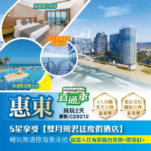 | 第1天 | 雙月灣漁家海鮮宴 | 客人自理 | 惠州雙月灣君廷度假酒店 | |