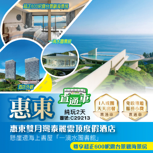 | 第1天 | 雙月灣漁家海鮮宴 | 客人自理 | 惠東雙月灣泰麗雲頂度假酒店 | |