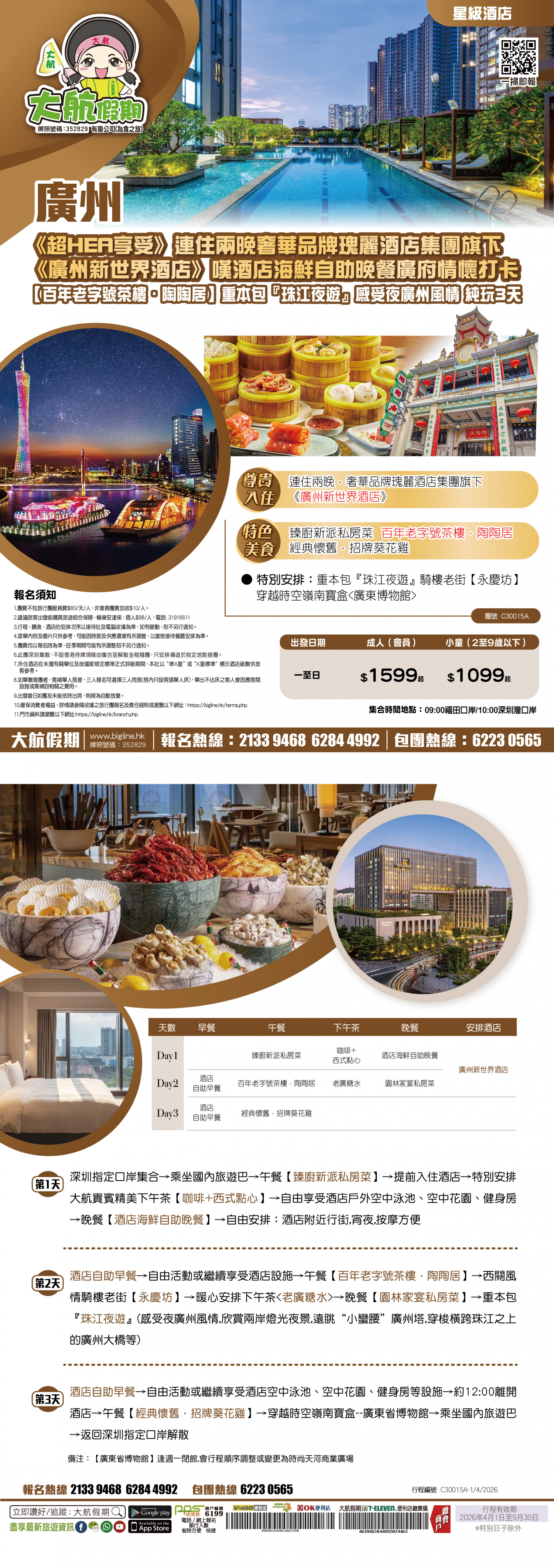 | 第2天 | 酒店自助早餐 | 廣府情懷打卡【百年老字號茶樓·陶陶居】 | 園林家宴私房菜 | 廣州新世界酒店 |