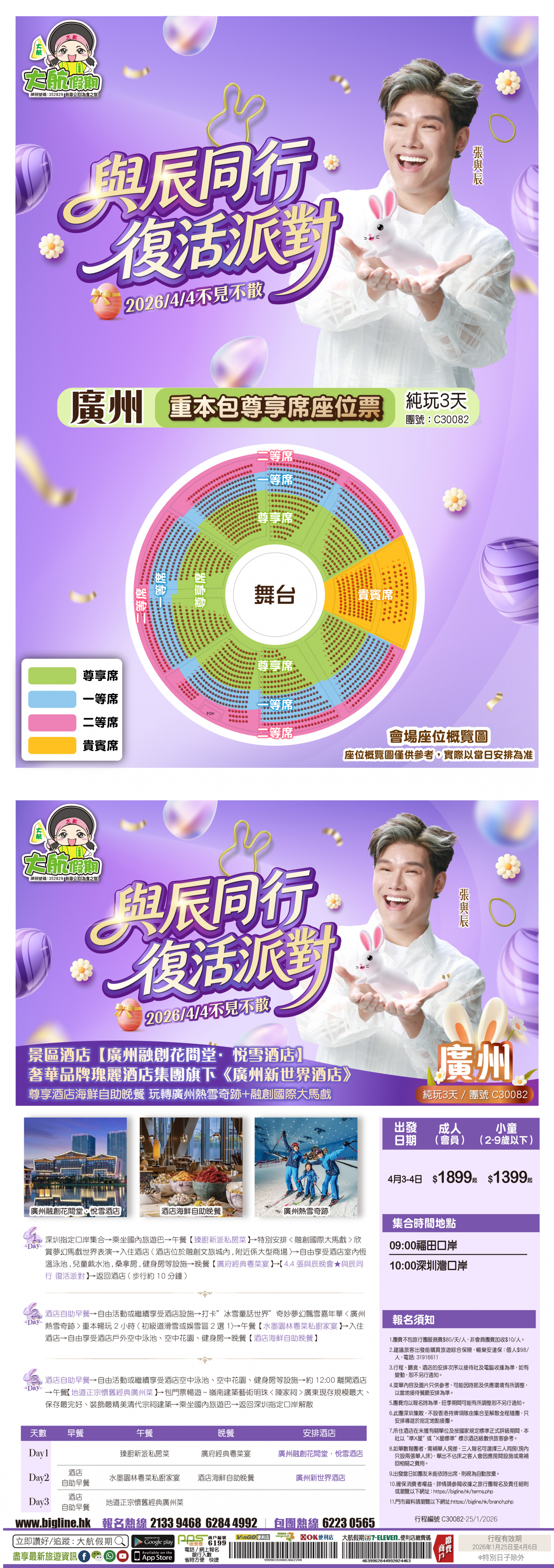 【4.4張與辰晚會★一等席座位票】《與辰同行 復活派對》+《泳池音樂酒會~嗨翻復活夜》重本包門票『廣州熱雪奇跡+融創國際大馬戲』入住鬧市中心~5星級《中山名座假日酒店》嘆酒店海鮮自助晚餐 純玩3天