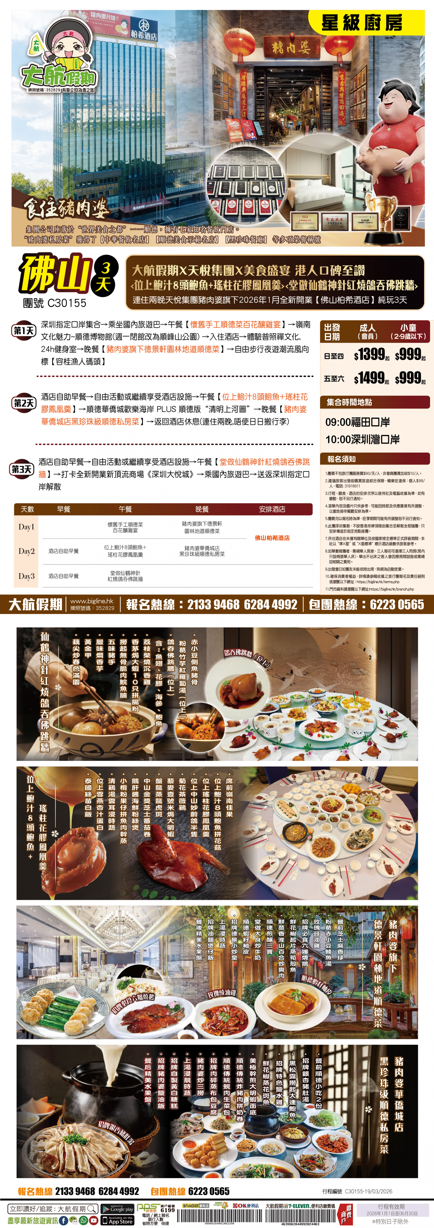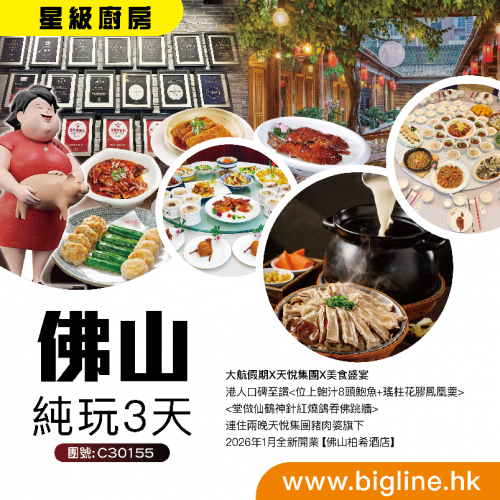 【星級廚房】大航假期X天悅集團X美食盛宴 港人口碑至讚<位上鮑汁8頭鮑魚+瑤柱花膠鳳凰羹><堂做仙鶴神針紅燒鴿吞佛跳牆>連住兩晚天悅集團豬肉婆旗下2026年1月全新開業【佛山柏希酒店】純玩3天