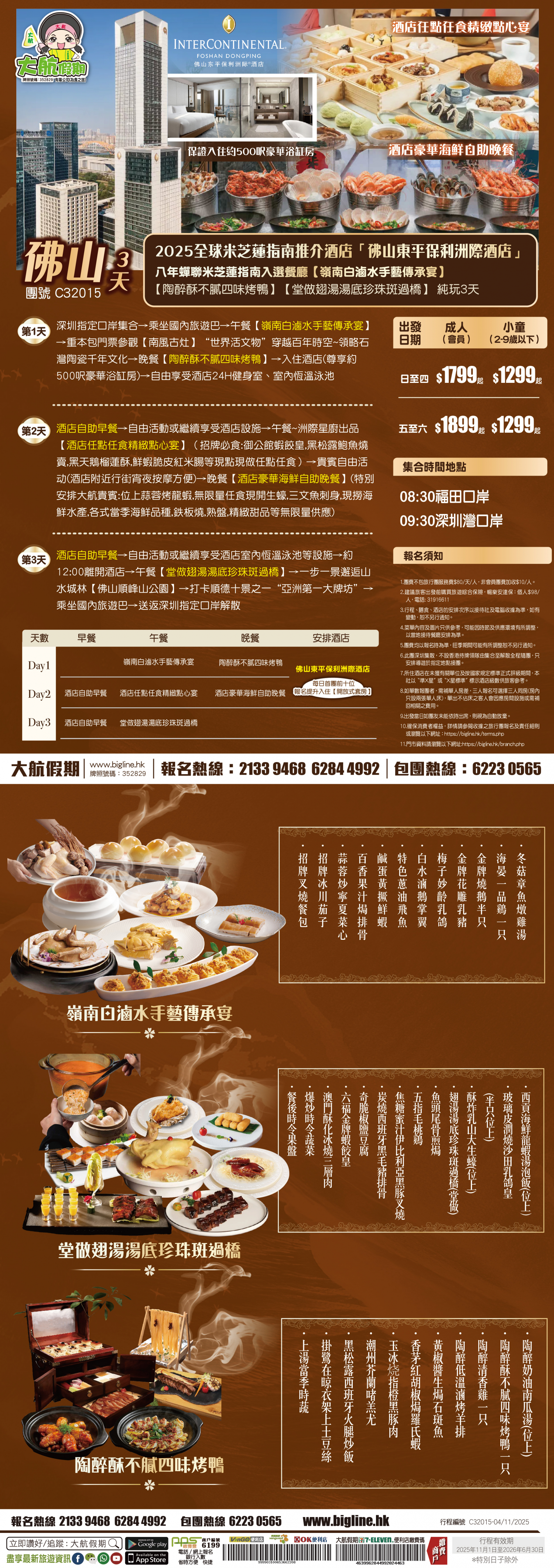 | 第2天 | 酒店自助早餐 | 洲際星廚出品【任點任食精緻點心宴】 | 酒店豪華海鮮自助晚餐 | 佛山東平保利洲際酒店 |
