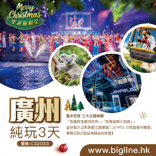 【聖誕節限定】重本安排三大主題樂園 「長隆野生動物世界」+「長隆國際大馬戲」+全球最大日本遊戲主題樂園「JOYPOLIS世嘉都市樂園」 豪嘆【酒店聖誕海鮮自助晚餐】 純玩3天
