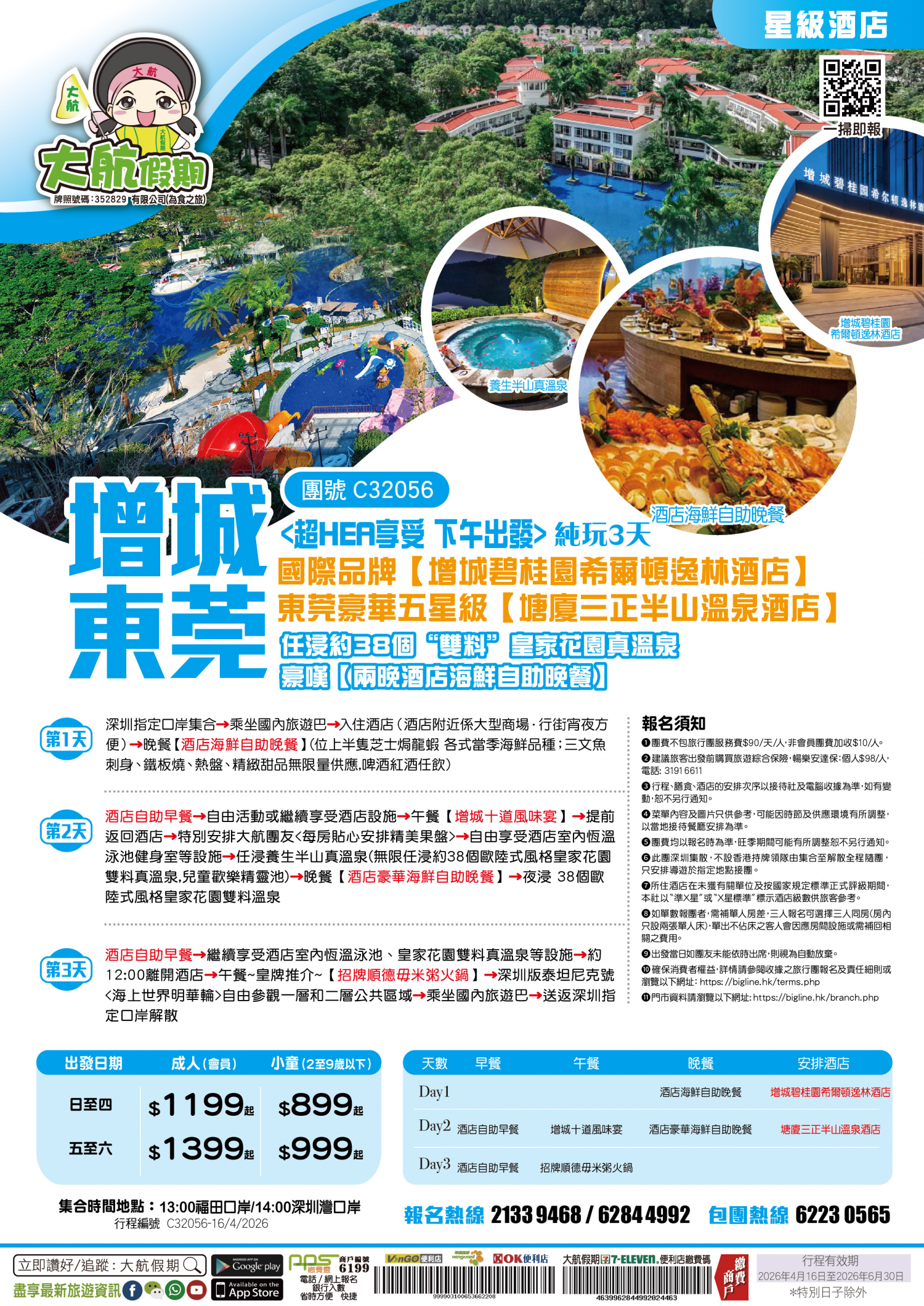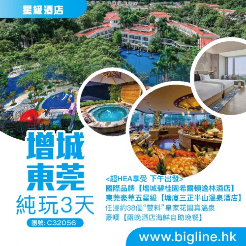| 第2天 | 酒店自助早餐 | 增城十道風味宴 | 酒店豪華海鮮自助晚餐 | 東莞塘廈三正半山酒店 |