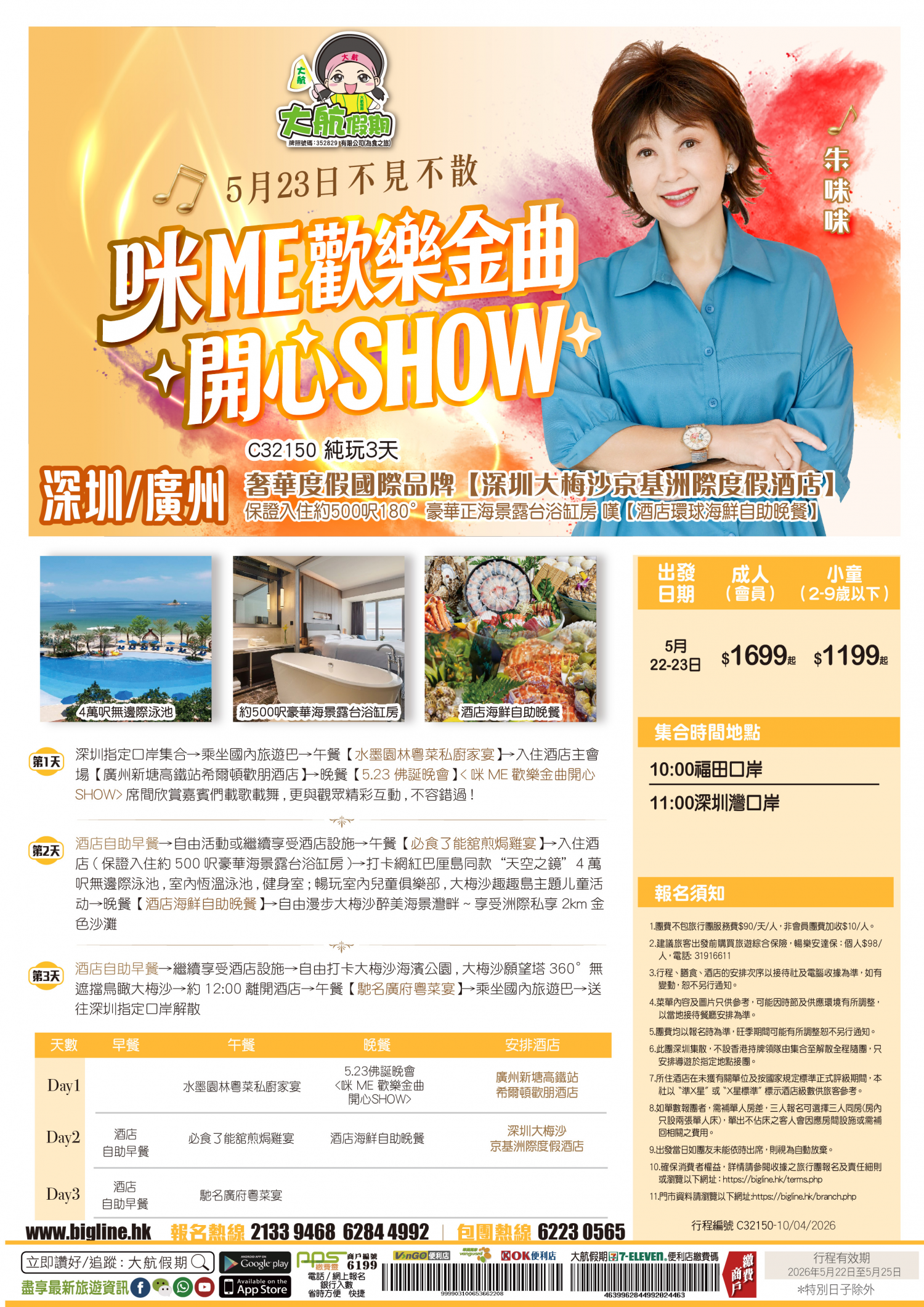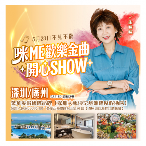 | 第1天 | 水墨園林粵菜私廚家宴 | 【5.23佛誕晚會】<咪 ME 歡樂金曲開心SHOW> | 廣州新塘高鐵站希爾頓歡朋酒店 | |