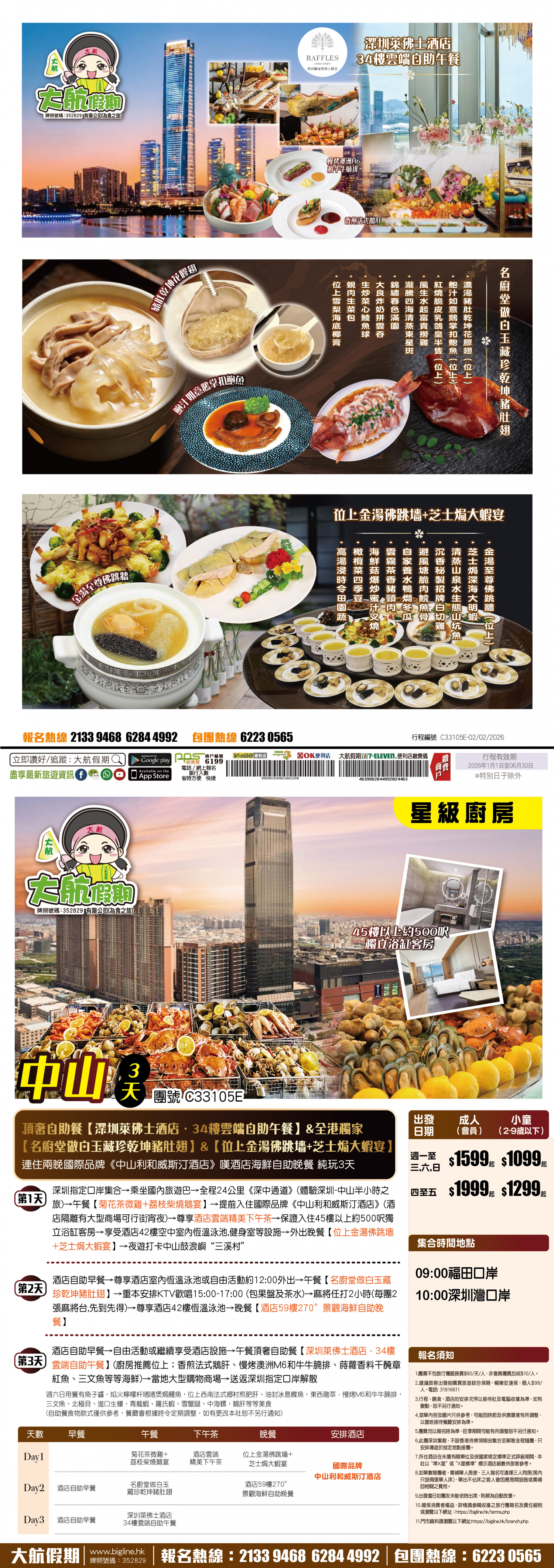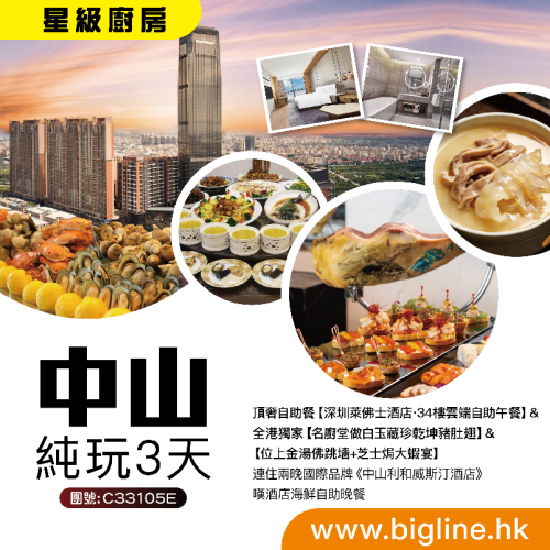 【星級廚房】頂奢自助餐【深圳萊佛士酒店·34樓雲端自助午餐】&全港獨家【名廚堂做白玉藏珍乾坤豬肚翅】&【位上金湯佛跳墻+芝士焗大蝦宴】連住兩晚國際品牌《中山利和威斯汀酒店》嘆酒店海鮮自助晚餐 純玩3天
