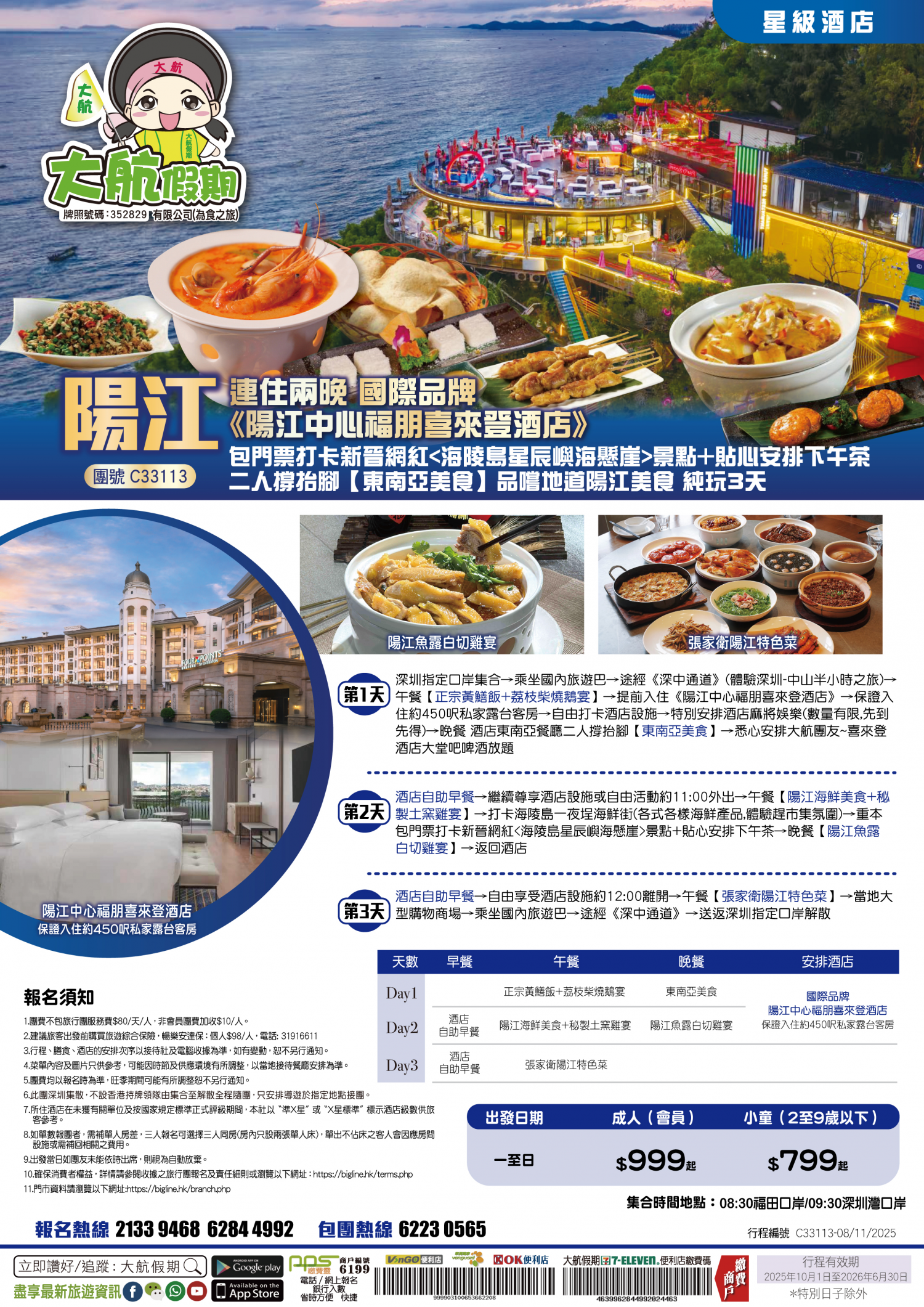 | 第1天 | 正宗黃鱔飯+荔枝柴燒鵝宴 | 東南亞風味宴 | 陽江中心福朋喜來登酒店 | |