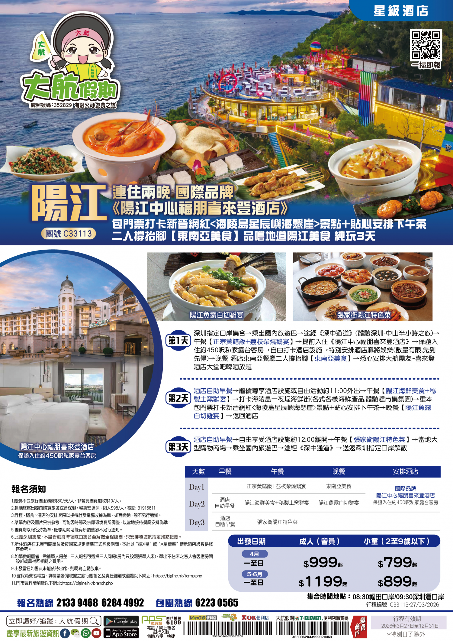 | 第2天 | 酒店自助早餐 | 陽江海鮮美食+秘製土窯雞宴 | 陽江魚露白切雞宴 | 陽江中心福朋喜來登酒店 |