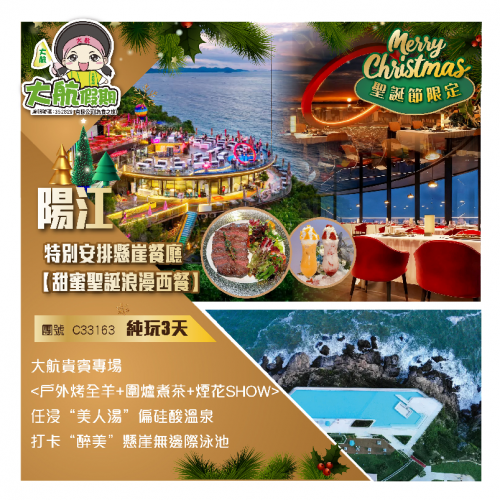 【聖誕節限定】特別安排懸崖餐廳【甜蜜聖誕浪漫西餐】大航貴賓專場<戶外烤全羊+圍爐煮茶+煙花SHOW> 任浸“美人湯”偏硅酸溫泉 打卡“醉美”懸崖無邊際泳池 純玩3天