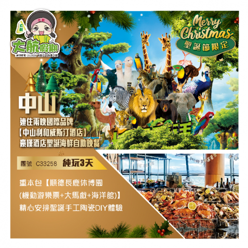 【聖誕節限定】連住兩晚國際品牌【中山利和威斯汀酒店】豪嘆酒店聖誕海鮮自助晚餐 重本包【順德長鹿休博園(機動游樂票+大馬戲+海洋館)】精心安排聖誕手工陶瓷DIY體驗 純玩3天