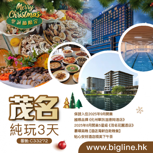 【聖誕節限定】保證入住2025年9月開業國際品牌《化州華訊溫德姆酒店》+2025年8月開業5星級《茂名花園酒店》豪嘆兩晚【酒店海鮮自助晚餐】貼心安排酒店精美下午茶 純玩3天