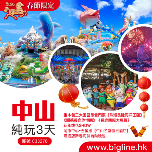 【春節限定】重本包三大園區昂貴門票《珠海長隆海洋王國》《順德長鹿休博園》《長鹿國際大馬戲》一年一度新年煙花SHOW 鬧市中心•五星級【中山名座假日酒店】嘆酒店新春海鮮自助晚餐 純玩3天