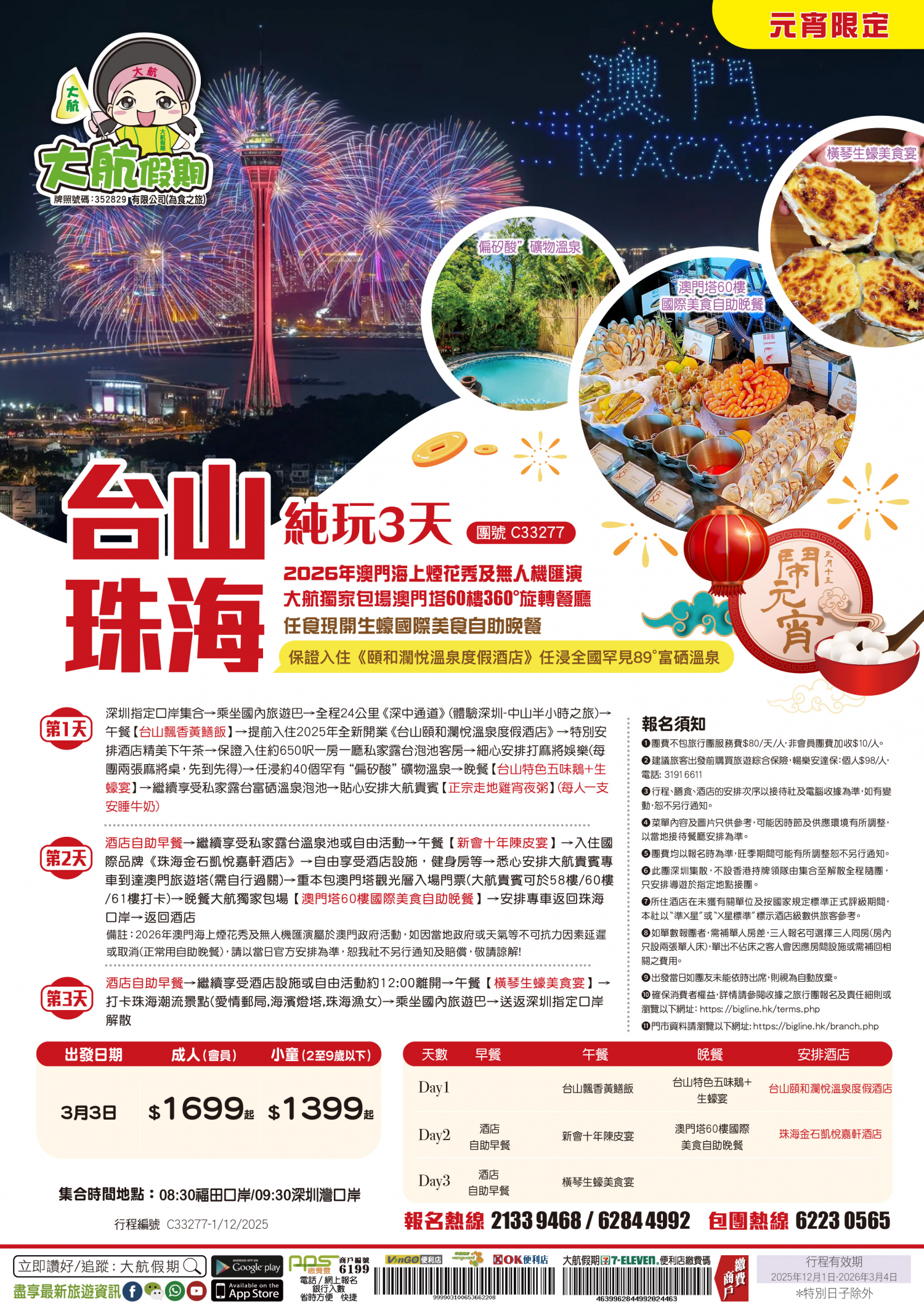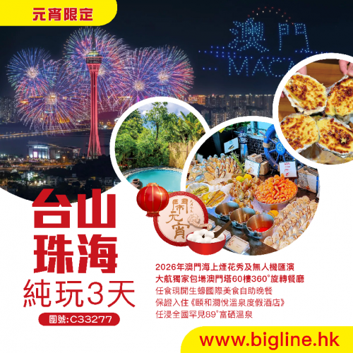 【元宵限定】2026年澳門海上煙花秀及無人機匯演 大航獨家包場澳門塔60樓360°旋轉餐廳 任食現開生蠔國際美食自助晚餐 保證入住《頤和瀾悅溫泉度假酒店》任浸全國罕見89°富硒溫泉 純玩3天