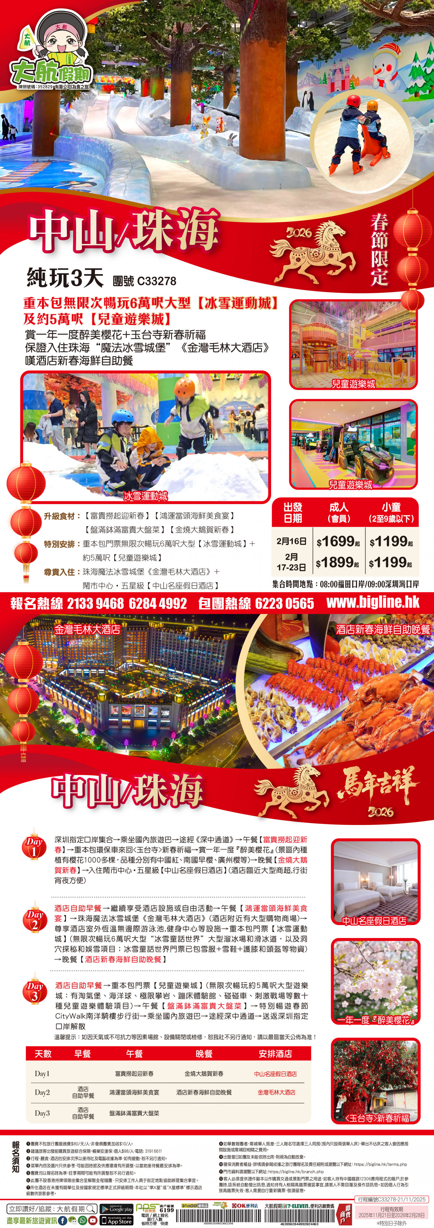 【春節限定】重本包無限次暢玩6萬呎大型【冰雪運動城】及約5萬呎【兒童遊樂城】賞一年一度醉美櫻花+玉台寺新春祈福 保證入住珠海“魔法冰雪城堡”《金灣毛林大酒店》嘆酒店新春海鮮自助餐 純玩3天