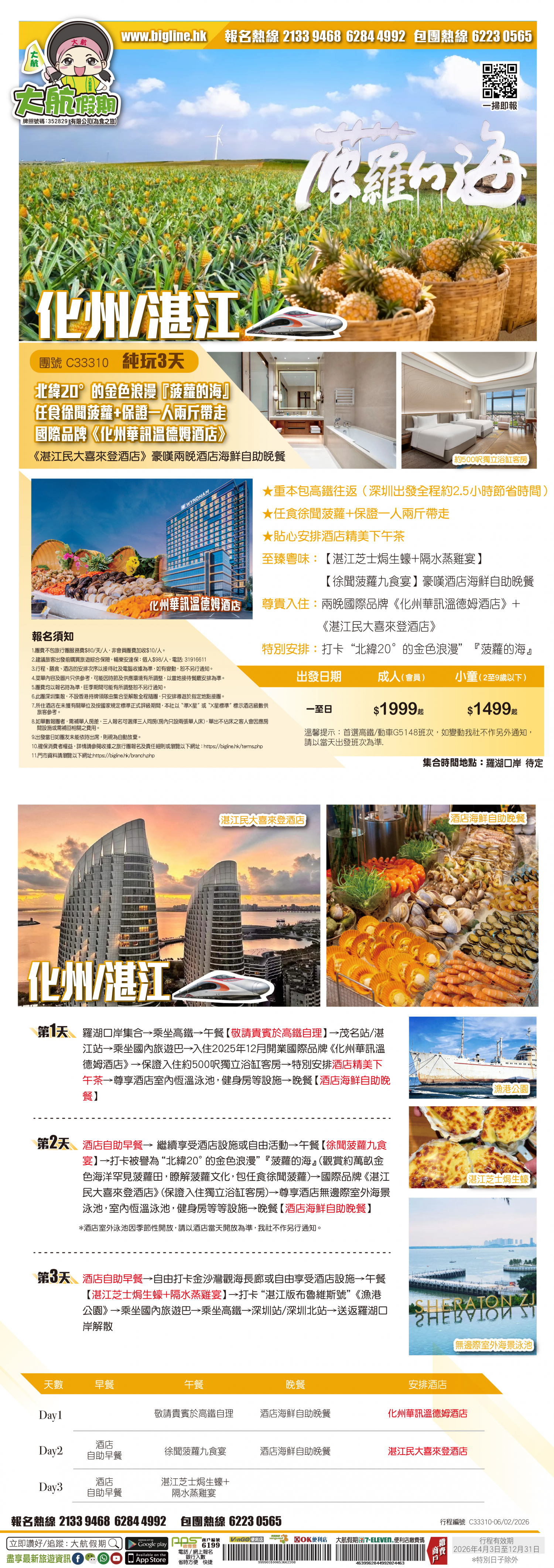 | 第1天 | 客人自理 | 酒店海鮮自助晚餐 | 化州華訊溫德姆酒店 | |