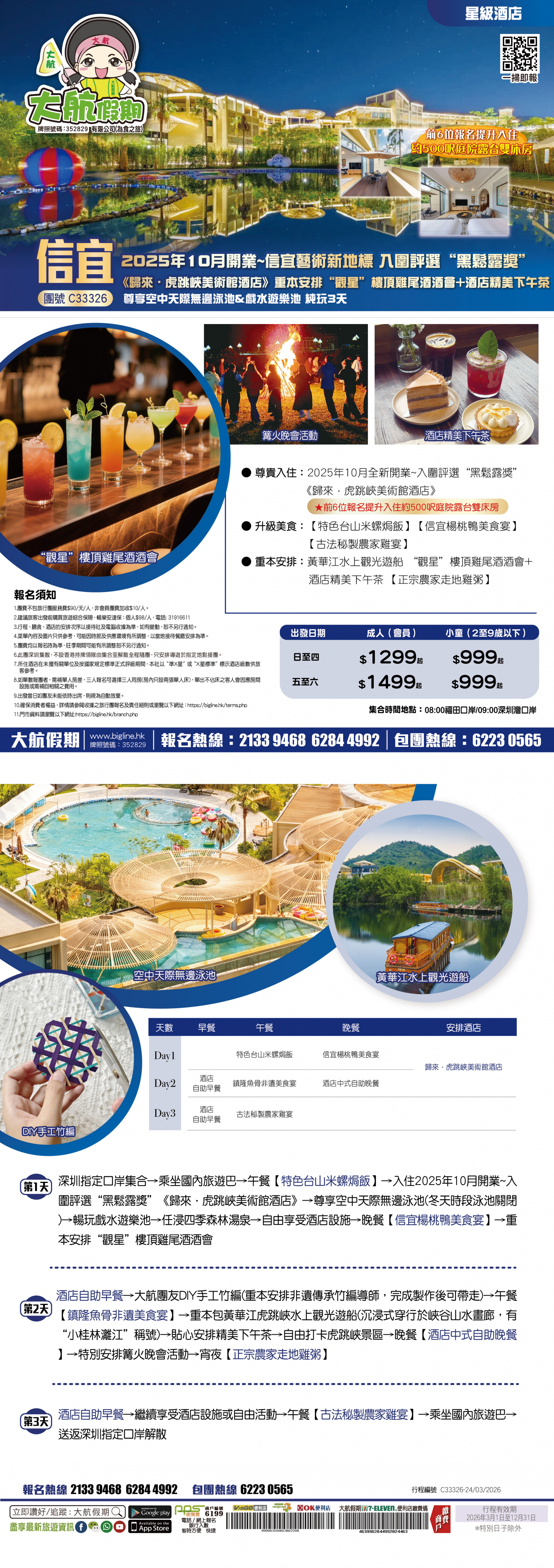 *團員繳付退票費後 (如適用): 1) 已繳款項可保留半年; 或 2) 選擇轉團後, 餘款則保留半年; 或 3) 可繳付『迫不得已理由』之手續費後, 取回已付餘款。 *個別機票+酒店套票產品如因『迫不得已理由』取消外遊行程, 處理旅客退款時亦按以上訂列收取每位退票費及手續費, 並以行程表 (套票單張) 所列為準。 責任細則: 1. 本公司保留合併團隊出發的權利。 2. 行程書或單張內所列費用根據當時機票價格及國際貨幣兌換率而訂立。外幣浮動等情況之下, 本公司保留在出發前調整各項費用的權利及徵收額外費用。 3. 所有列出的交通服務資料只供參考, 如有更改概不負責, 一切須以出票時為準。 4. 除本公司直接提供之服務外, 本公司及其職員或附屬公司或與本公司有經營關係之公司代理人身份在香港或外地安排其他獨立機構所提供之交通工具 (如飛機、輪船、火車、或遊覽巴士等) 、住宿、膳食或娛樂觀光項目等 (“委託機構”), 團員如遇交通延誤、行李遺失、意外傷亡或財物損失等, 該依照當地法律向擁有、管理或操作之委託機構直接交涉或追討賠償, 通常該等機構均各訂位不同條例, 以對客人負責。在此情況下, 本公司概不對該等損失或傷亡負責。 5. 除因由本公司之員工或其他直接管理或操作之機構之疏忽而引致團員之個人傷亡外, 本公司對團員在任何意外中之個人傷亡、經濟、娛樂或精神損失概不負責。 6. 除經本公司同意及安排, 如團員自行更改由其他人士代為參團, 本公司或其委託機構之職員有權取消其隨團之資格, 而無須發還任何團費, 而該人士在隨團期間之保險、責任賠償、行為後果等均由該人仕自行承擔。 7. 如因天氣、罷工、戰爭、怠工或安全情況影響而引致有關交通工具暫停服務, 停航或其他事故, 而必須將行程更改或取消部份行程, 本公司則將團員所繳交之費用扣除因以上事故而引致之損失後, 退回差額給團員。 8. 有關住宿、膳食、遊覽節目等問題, 均依據行程表安排, 行程先後次序有可能需要更改, 一切以當地安排為準。若遇特殊情況, 如簽證受阻, 當地酒店突告客滿或航機改變飛行時間或地點, 以及非本公司或其委託機構所能控制之因素, 令旅行團節目有增減, 或臨時更改交通工具、班機時間、機種及更換酒店等等, 本公司或其委託機構得依當時情況全權盡力處理, 團員不得藉故反對或退出, 因故取消之節目, 將不獲退還款項, 任何因延期而引致之額外支出, 本公司或其委託機構概不負責。 9. 所有酒店及住宿根據行程安排, 本公司視乎當時情形作出更改, 但不限於遇展覽會或特殊情況下, 將住宿鄰近城市之同等級酒店及住宿代替。本公司如因『迫不得已理由(外遊)』(即指戰爭、政治動盪、恐怖襲擊、天災、疫症、惡劣天氣、交通工具發生技術問題、載運機構臨時更改班次或取消服務、罷工、工業行動、旅遊目的地政府或世界衛生組織發出旅遊警示(警告)、香港特別行政區政府發出紅色或黑色外遊警示、不可抗力事件,以及業界不能控制的其他不利離開香港或在香港境外旅遊的情況)於外遊旅行團出發後更改任何項目而引致成本增加,可向顧客徵收額外費用。 10. 【已成團】代表該團號之指定出發日期預訂機位或已有足夠人數報名參加。但出發與否還受其他因素影響, 本公司保留最終決定權。 11. 任何團員在參與各項活動時, 如經常不遵守服飾人員之指引或安排, 在行動或言語上侮辱或滋擾其他團員或工作人員, 本公司或其委託機構職員有權視具體情況而取消其隨團資格而母須發任何團費, 而受該旅客監護之18歲以下同行團員亦須一併離開, 有關旅客離團後一切活動, 概與本公司或其委託機構無關。 12. 團員如欲於旅程完畢後延期返港, 須於出發前十四天提出, 以便本公司代為預定返港機位, 延期返港之機位, 未能即時作實, 團員不得藉此理由要求退出, 旅程完畢後延期逗留之費用, 概由團員自負。 13. 延期返港之團友, 必須在離境前七十二小時向航空公司確實回程機位, 任何機位如有變更, 概與本公司無關。 14. 團員如在旅途中自行離團或放棄行程, 離團後之責任自負, 一切後果與本公司或其委託機構無關。 15. 參團者須切實遵守各國及各地法例, 包括但不限於防疫防控條例, 並嚴禁攜帶違例物品出入境, 並照實申報攜帶之物品及現金。 16. 任何種類的簽證審批權及出入境批准權一律由該國或地區之領事館及/或出入境部門全權決定, 出入境如有問題, 責任旅客自負, 本公司或其委託機構母須負任何責任。如簽證已代辦, 簽證費恕不退還。 17. 即使團員持有效之入境簽證及旅遊證件, 而於入境時被當值之移民局海關人員拒絕入境, 本公司或其委託機構亦無須負任何責任。所需額外安排之食宿、交通費用、全部由其本人負責, 其餘下的行程亦將不會獲得任何補償, 亦不得要求退款或改團。 18. 中國內地相關法規規定, 即日起旅客入住中國內地境內酒店時, 公安機關會透過酒店前台向旅客一併採集人像信息資訊。 19. 如出現一些非本公司能力範圍可控制之問題 (如花卉、紅葉提早凋謝或景觀、自然現象、景點活動或戶外項目) 會受天氣等因素影響, 如未能安排則取消不作任何退款安排。 20. 旅客如在旅程中確診 COVID-19或其他傳染病,無論受到當地政府隔離或其他檢疫要求影響與否,為確保其他旅客之安全,確診旅