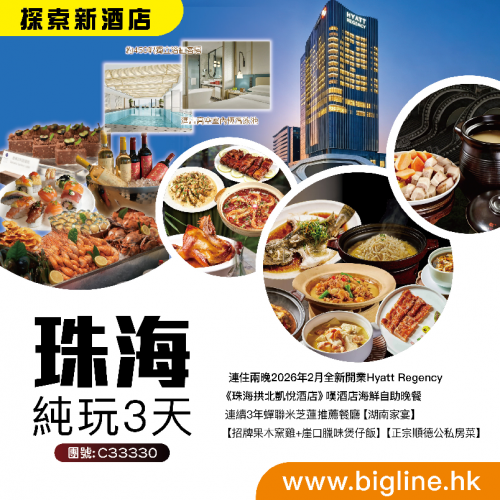 【探索新酒店】連住兩晚2026年2月全新開業HyattRegency《珠海拱北凱悅酒店》嘆酒店海鮮自助晚餐連續3年蟬聯米芝蓮推薦【湖南家宴】【招牌果木窯雞+崖口臘味煲仔飯】【正宗順德公私房菜】純玩3天