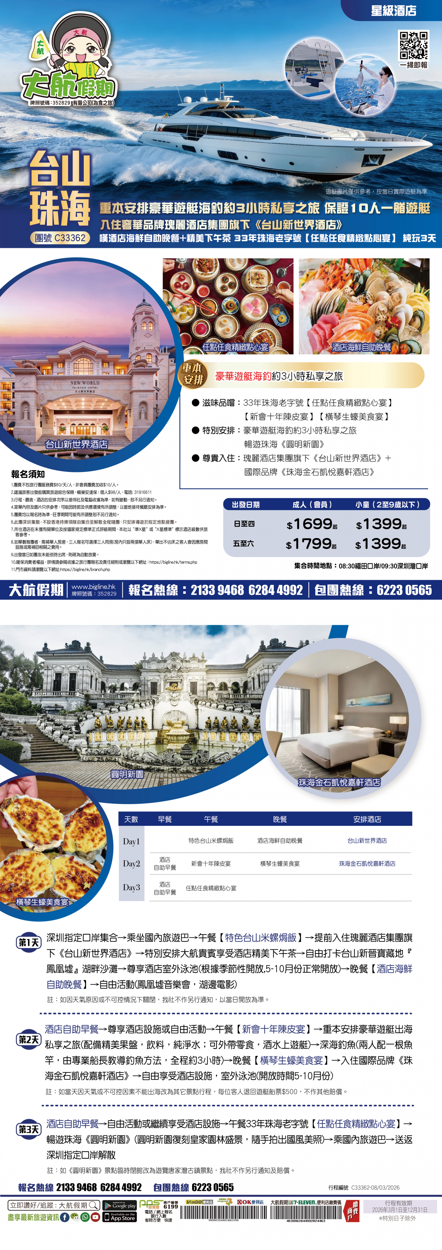| 第1天 | 特色台山米螺焗饭 | 酒店海鮮自助晚餐 | 台山新世界酒店 | |