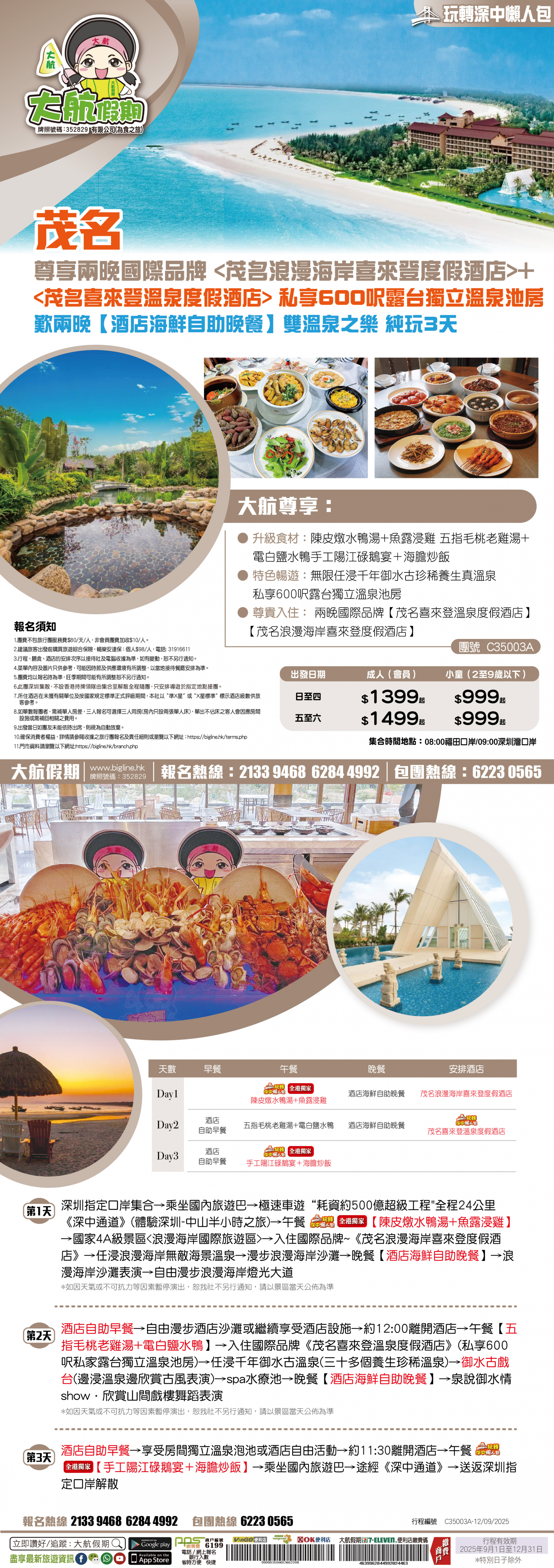 | 第2天 | 酒店自助早餐 | 五指毛桃老雞湯+電白鹽水鴨 | 酒店海鮮自助晚餐 | 茂名喜來登溫泉度假酒店 |