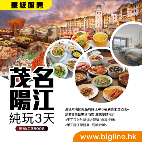 【星級廚房】連住兩晚國際品牌《陽江中心福朋喜來登酒店》+《茂名電白華美達酒店》皇牌推介<手工豆豉砂鍋焗大花蟹+魚露浸雞><手工陽江碌鵝宴+海膽炒飯>純玩3天