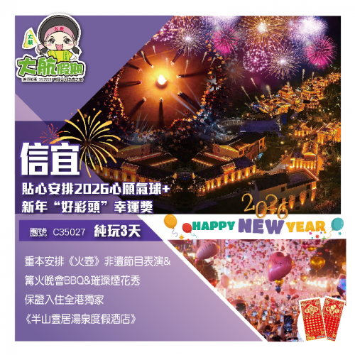 【新年倒數2026】貼心安排2026心願氣球+新年“好彩頭”幸運獎 重本安排《火壺》非遺節目表演&篝火晚會BBQ&璀璨煙花秀 保證入住全港獨家《半山雲居湯泉度假酒店》純玩3天