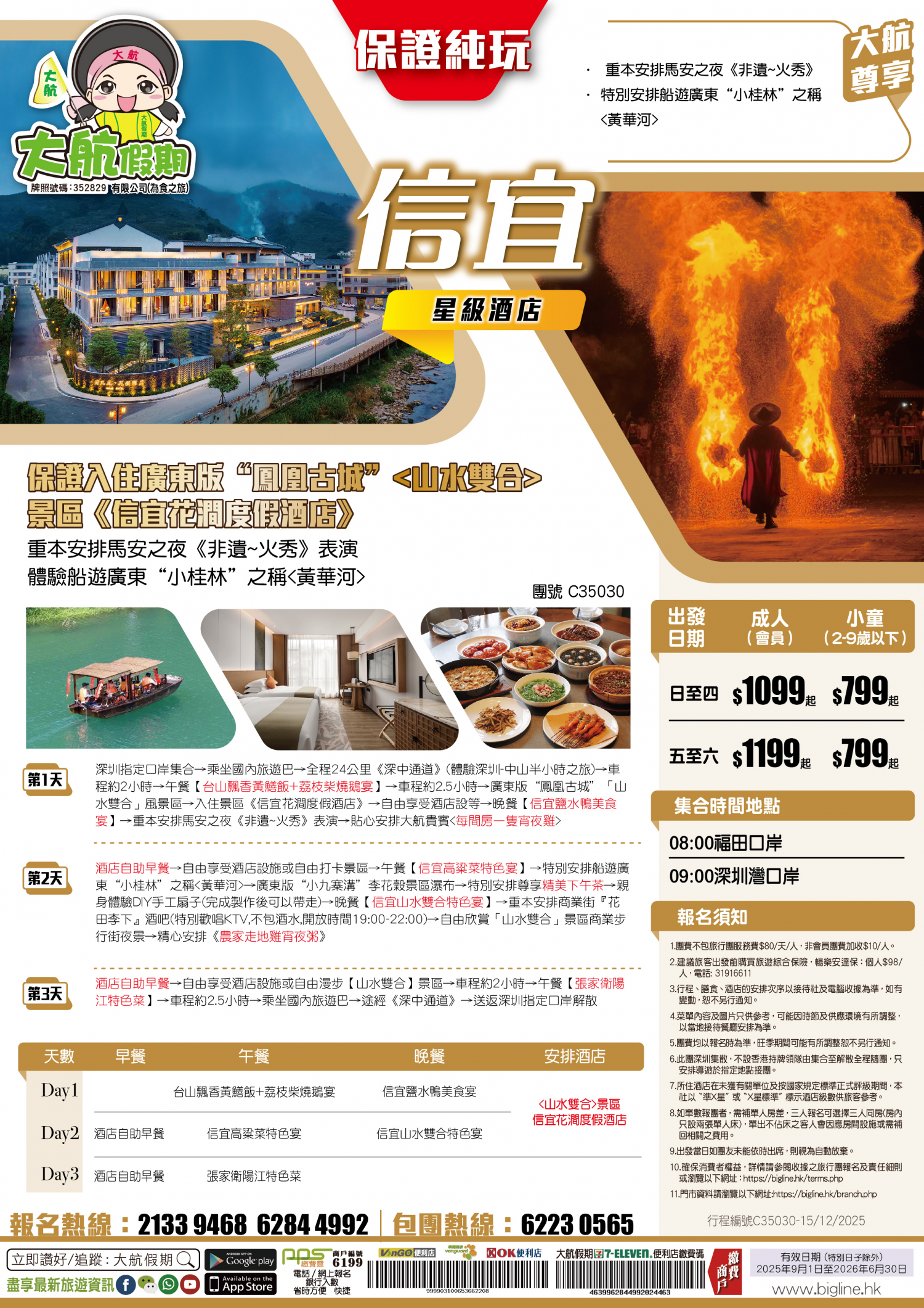 *團員繳付退票費後 (如適用): 1) 已繳款項可保留半年; 或 2) 選擇轉團後, 餘款則保留半年; 或 3) 可繳付『迫不得已理由』之手續費後, 取回已付餘款。 *個別機票+酒店套票產品如因『迫不得已理由』取消外遊行程, 處理旅客退款時亦按以上訂列收取每位退票費及手續費, 並以行程表 (套票單張) 所列為準。 責任細則: 1. 本公司保留合併團隊出發的權利。 2. 行程書或單張內所列費用根據當時機票價格及國際貨幣兌換率而訂立。外幣浮動等情況之下, 本公司保留在出發前調整各項費用的權利及徵收額外費用。 3. 所有列出的交通服務資料只供參考, 如有更改概不負責, 一切須以出票時為準。 4. 除本公司直接提供之服務外, 本公司及其職員或附屬公司或與本公司有經營關係之公司代理人身份在香港或外地安排其他獨立機構所提供之交通工具 (如飛機、輪船、火車、或遊覽巴士等) 、住宿、膳食或娛樂觀光項目等 (“委託機構”), 團員如遇交通延誤、行李遺失、意外傷亡或財物損失等, 該依照當地法律向擁有、管理或操作之委託機構直接交涉或追討賠償, 通常該等機構均各訂位不同條例, 以對客人負責。在此情況下, 本公司概不對該等損失或傷亡負責。 5. 除因由本公司之員工或其他直接管理或操作之機構之疏忽而引致團員之個人傷亡外, 本公司對團員在任何意外中之個人傷亡、經濟、娛樂或精神損失概不負責。 6. 除經本公司同意及安排, 如團員自行更改由其他人士代為參團, 本公司或其委託機構之職員有權取消其隨團之資格, 而無須發還任何團費, 而該人士在隨團期間之保險、責任賠償、行為後果等均由該人仕自行承擔。 7. 如因天氣、罷工、戰爭、怠工或安全情況影響而引致有關交通工具暫停服務, 停航或其他事故, 而必須將行程更改或取消部份行程, 本公司則將團員所繳交之費用扣除因以上事故而引致之損失後, 退回差額給團員。 8. 有關住宿、膳食、遊覽節目等問題, 均依據行程表安排, 行程先後次序有可能需要更改, 一切以當地安排為準。若遇特殊情況, 如簽證受阻, 當地酒店突告客滿或航機改變飛行時間或地點, 以及非本公司或其委託機構所能控制之因素, 令旅行團節目有增減, 或臨時更改交通工具、班機時間、機種及更換酒店等等, 本公司或其委託機構得依當時情況全權盡力處理, 團員不得藉故反對或退出, 因故取消之節目, 將不獲退還款項, 任何因延期而引致之額外支出, 本公司或其委託機構概不負責。 9. 所有酒店及住宿根據行程安排, 本公司視乎當時情形作出更改, 但不限於遇展覽會或特殊情況下, 將住宿鄰近城市之同等級酒店及住宿代替。本公司如因『迫不得已理由(外遊)』(即指戰爭、政治動盪、恐怖襲擊、天災、疫症、惡劣天氣、交通工具發生技術問題、載運機構臨時更改班次或取消服務、罷工、工業行動、旅遊目的地政府或世界衛生組織發出旅遊警示(警告)、香港特別行政區政府發出紅色或黑色外遊警示、不可抗力事件,以及業界不能控制的其他不利離開香港或在香港境外旅遊的情況)於外遊旅行團出發後更改任何項目而引致成本增加,可向顧客徵收額外費用。 10. 【已成團】代表該團號之指定出發日期預訂機位或已有足夠人數報名參加。但出發與否還受其他因素影響, 本公司保留最終決定權。 11. 任何團員在參與各項活動時, 如經常不遵守服飾人員之指引或安排, 在行動或言語上侮辱或滋擾其他團員或工作人員, 本公司或其委託機構職員有權視具體情況而取消其隨團資格而母須發任何團費, 而受該旅客監護之18歲以下同行團員亦須一併離開, 有關旅客離團後一切活動, 概與本公司或其委託機構無關。 12. 團員如欲於旅程完畢後延期返港, 須於出發前十四天提出, 以便本公司代為預定返港機位, 延期返港之機位, 未能即時作實, 團員不得藉此理由要求退出, 旅程完畢後延期逗留之費用, 概由團員自負。 13. 延期返港之團友, 必須在離境前七十二小時向航空公司確實回程機位, 任何機位如有變更, 概與本公司無關。 14. 團員如在旅途中自行離團或放棄行程, 離團後之責任自負, 一切後果與本公司或其委託機構無關。 15. 參團者須切實遵守各國及各地法例, 包括但不限於防疫防控條例, 並嚴禁攜帶違例物品出入境, 並照實申報攜帶之物品及現金。 16. 任何種類的簽證審批權及出入境批准權一律由該國或地區之領事館及/或出入境部門全權決定, 出入境如有問題, 責任旅客自負, 本公司或其委託機構母須負任何責任。如簽證已代辦, 簽證費恕不退還。 17. 即使團員持有效之入境簽證及旅遊證件, 而於入境時被當值之移民局海關人員拒絕入境, 本公司或其委託機構亦無須負任何責任。所需額外安排之食宿、交通費用、全部由其本人負責, 其餘下的行程亦將不會獲得任何補償, 亦不得要求退款或改團。 18. 中國內地相關法規規定, 即日起旅客入住中國內地境內酒店時, 公安機關會透過酒店前台向旅客一併採集人像信息資訊。 19. 如出現一些非本公司能力範圍可控制之問題 (如花卉、紅葉提早凋謝或景觀、自然現象、景點活動或戶外項目) 會受天氣等因素影響, 如未能安排則取消不作任何退款安排。 20. 旅客如在旅程中確診 COVID-19或其他傳染病,無論受到當地政府隔離或其他檢疫要求影響與否,為確保其他旅客之安全,確診旅