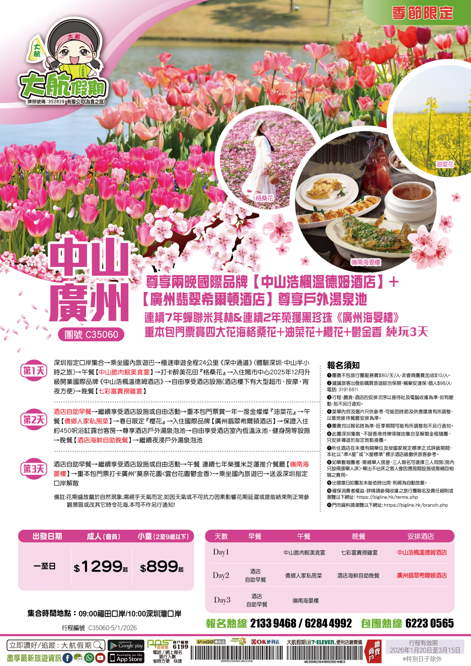 *團員繳付退票費後 (如適用): 1) 已繳款項可保留半年; 或 2) 選擇轉團後, 餘款則保留半年; 或 3) 可繳付『迫不得已理由』之手續費後, 取回已付餘款。 *個別機票+酒店套票產品如因『迫不得已理由』取消外遊行程, 處理旅客退款時亦按以上訂列收取每位退票費及手續費, 並以行程表 (套票單張) 所列為準。 責任細則: 1. 本公司保留合併團隊出發的權利。 2. 行程書或單張內所列費用根據當時機票價格及國際貨幣兌換率而訂立。外幣浮動等情況之下, 本公司保留在出發前調整各項費用的權利及徵收額外費用。 3. 所有列出的交通服務資料只供參考, 如有更改概不負責, 一切須以出票時為準。 4. 除本公司直接提供之服務外, 本公司及其職員或附屬公司或與本公司有經營關係之公司代理人身份在香港或外地安排其他獨立機構所提供之交通工具 (如飛機、輪船、火車、或遊覽巴士等) 、住宿、膳食或娛樂觀光項目等 (“委託機構”), 團員如遇交通延誤、行李遺失、意外傷亡或財物損失等, 該依照當地法律向擁有、管理或操作之委託機構直接交涉或追討賠償, 通常該等機構均各訂位不同條例, 以對客人負責。在此情況下, 本公司概不對該等損失或傷亡負責。 5. 除因由本公司之員工或其他直接管理或操作之機構之疏忽而引致團員之個人傷亡外, 本公司對團員在任何意外中之個人傷亡、經濟、娛樂或精神損失概不負責。 6. 除經本公司同意及安排, 如團員自行更改由其他人士代為參團, 本公司或其委託機構之職員有權取消其隨團之資格, 而無須發還任何團費, 而該人士在隨團期間之保險、責任賠償、行為後果等均由該人仕自行承擔。 7. 如因天氣、罷工、戰爭、怠工或安全情況影響而引致有關交通工具暫停服務, 停航或其他事故, 而必須將行程更改或取消部份行程, 本公司則將團員所繳交之費用扣除因以上事故而引致之損失後, 退回差額給團員。 8. 有關住宿、膳食、遊覽節目等問題, 均依據行程表安排, 行程先後次序有可能需要更改, 一切以當地安排為準。若遇特殊情況, 如簽證受阻, 當地酒店突告客滿或航機改變飛行時間或地點, 以及非本公司或其委託機構所能控制之因素, 令旅行團節目有增減, 或臨時更改交通工具、班機時間、機種及更換酒店等等, 本公司或其委託機構得依當時情況全權盡力處理, 團員不得藉故反對或退出, 因故取消之節目, 將不獲退還款項, 任何因延期而引致之額外支出, 本公司或其委託機構概不負責。 9. 所有酒店及住宿根據行程安排, 本公司視乎當時情形作出更改, 但不限於遇展覽會或特殊情況下, 將住宿鄰近城市之同等級酒店及住宿代替。本公司如因『迫不得已理由(外遊)』(即指戰爭、政治動盪、恐怖襲擊、天災、疫症、惡劣天氣、交通工具發生技術問題、載運機構臨時更改班次或取消服務、罷工、工業行動、旅遊目的地政府或世界衛生組織發出旅遊警示(警告)、香港特別行政區政府發出紅色或黑色外遊警示、不可抗力事件,以及業界不能控制的其他不利離開香港或在香港境外旅遊的情況)於外遊旅行團出發後更改任何項目而引致成本增加,可向顧客徵收額外費用。 10. 【已成團】代表該團號之指定出發日期預訂機位或已有足夠人數報名參加。但出發與否還受其他因素影響, 本公司保留最終決定權。 11. 任何團員在參與各項活動時, 如經常不遵守服飾人員之指引或安排, 在行動或言語上侮辱或滋擾其他團員或工作人員, 本公司或其委託機構職員有權視具體情況而取消其隨團資格而母須發任何團費, 而受該旅客監護之18歲以下同行團員亦須一併離開, 有關旅客離團後一切活動, 概與本公司或其委託機構無關。 12. 團員如欲於旅程完畢後延期返港, 須於出發前十四天提出, 以便本公司代為預定返港機位, 延期返港之機位, 未能即時作實, 團員不得藉此理由要求退出, 旅程完畢後延期逗留之費用, 概由團員自負。 13. 延期返港之團友, 必須在離境前七十二小時向航空公司確實回程機位, 任何機位如有變更, 概與本公司無關。 14. 團員如在旅途中自行離團或放棄行程, 離團後之責任自負, 一切後果與本公司或其委託機構無關。 15. 參團者須切實遵守各國及各地法例, 包括但不限於防疫防控條例, 並嚴禁攜帶違例物品出入境, 並照實申報攜帶之物品及現金。 16. 任何種類的簽證審批權及出入境批准權一律由該國或地區之領事館及/或出入境部門全權決定, 出入境如有問題, 責任旅客自負, 本公司或其委託機構母須負任何責任。如簽證已代辦, 簽證費恕不退還。 17. 即使團員持有效之入境簽證及旅遊證件, 而於入境時被當值之移民局海關人員拒絕入境, 本公司或其委託機構亦無須負任何責任。所需額外安排之食宿、交通費用、全部由其本人負責, 其餘下的行程亦將不會獲得任何補償, 亦不得要求退款或改團。 18. 中國內地相關法規規定, 即日起旅客入住中國內地境內酒店時, 公安機關會透過酒店前台向旅客一併採集人像信息資訊。 19. 如出現一些非本公司能力範圍可控制之問題 (如花卉、紅葉提早凋謝或景觀、自然現象、景點活動或戶外項目) 會受天氣等因素影響, 如未能安排則取消不作任何退款安排。 20. 旅客如在旅程中確診 COVID-19或其他傳染病,無論受到當地政府隔離或其他檢疫要求影響與否,為確保其他旅客之安全,確診旅