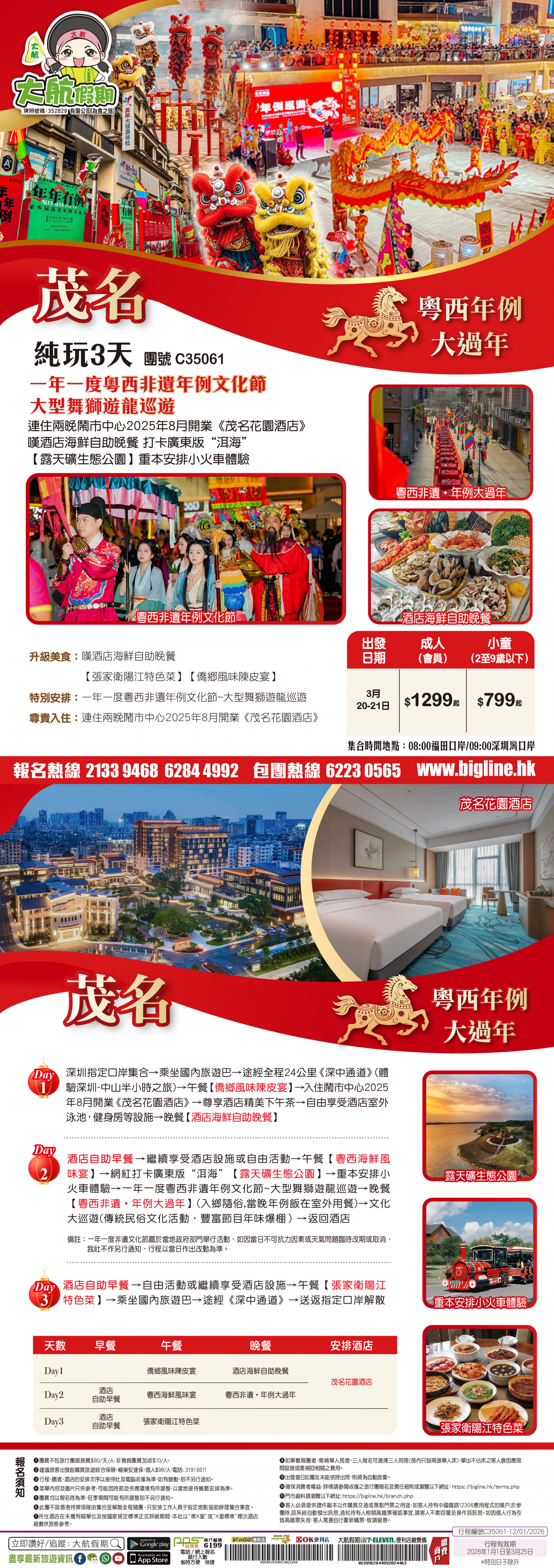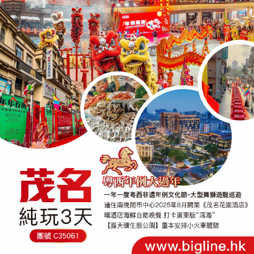【粵西年例大過年】一年一度粵西非遺年例文化節~大型舞獅遊龍巡遊 連住兩晚鬧市中心2025年8月開業《茂名花園酒店》嘆酒店海鮮自助晚餐 打卡廣東版“洱海”【露天礦生態公園】重本安排小火車體驗 純玩3天