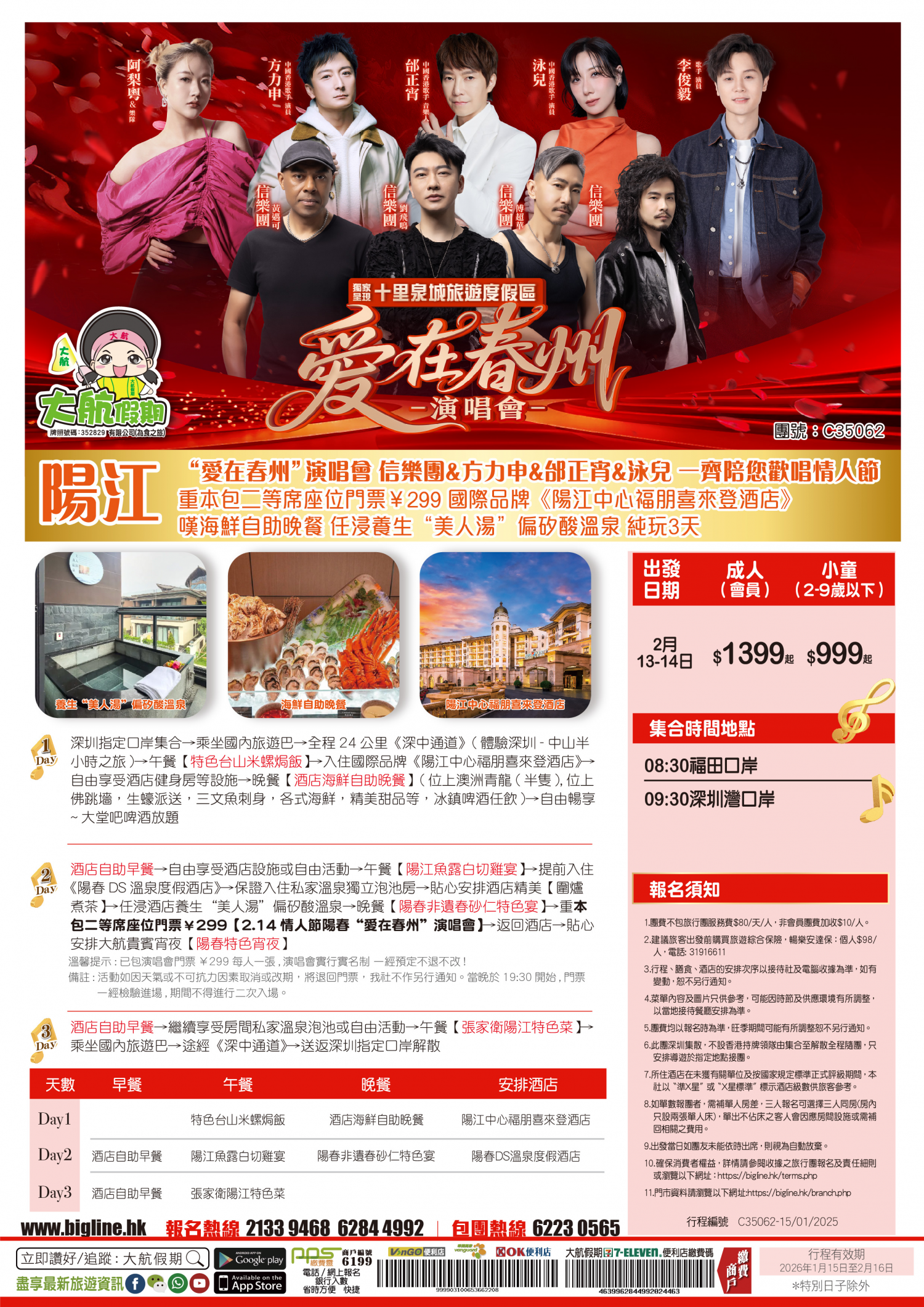 | 第2天 | 酒店自助早餐 | 陽江魚露白切雞宴 | 陽春春砂仁風味宴 | 陽春DS溫泉度假酒店 |