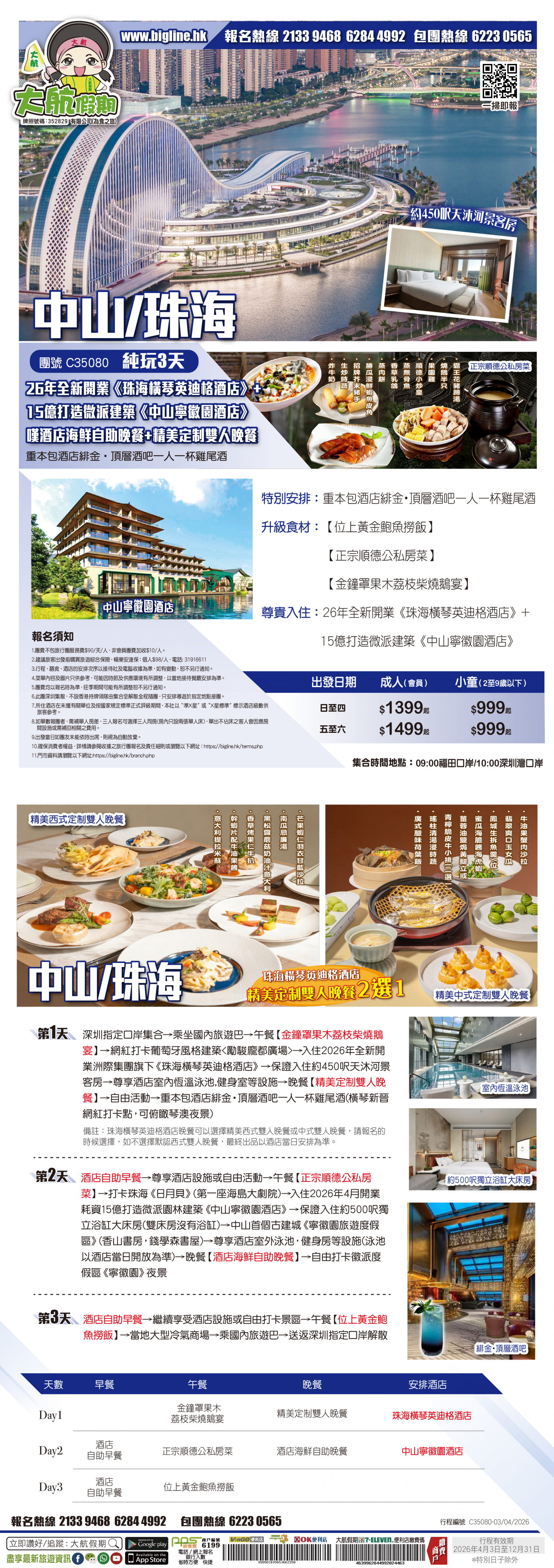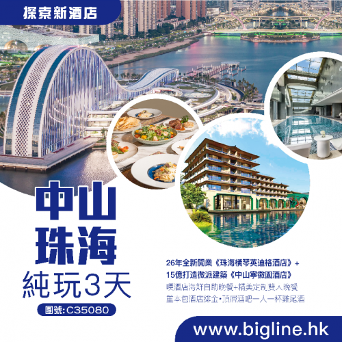【探索新酒店】26年全新開業《珠海橫琴英迪格酒店》+15億打造微派建築《中山寧徽園酒店》嘆酒店海鮮自助晚餐+精美定制雙人晚餐 重本包酒店緋金・頂層酒吧一人一杯雞尾酒 純玩3天