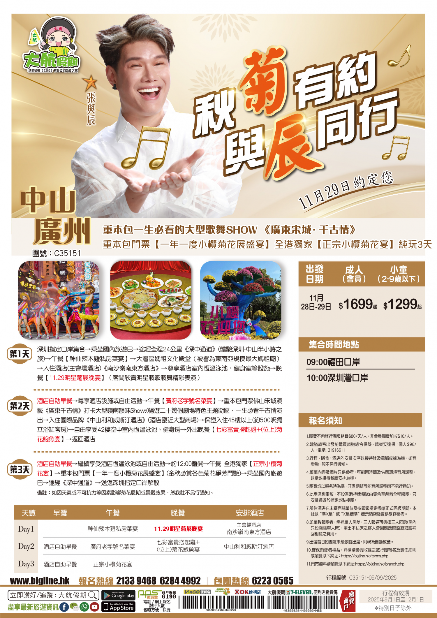 | 第3天 | 酒店自助早餐 | 全港獨家【正宗小欖菊花宴】 |